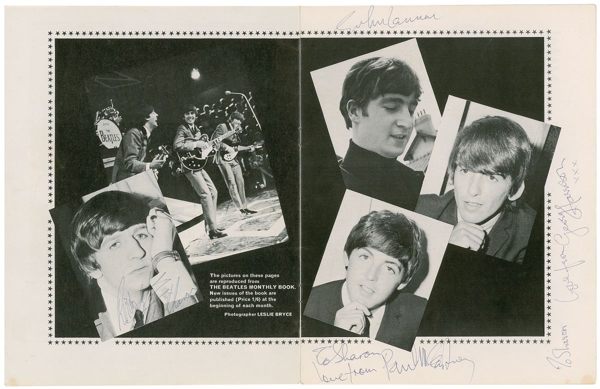 Fabulous program from The Beatles' Second Christmas Show, presented at the Hammersmith Odeon from December 24, 1964, to January 16, 1965, 8.25 x 10.75, signed and inscribed in blue ballpoint on the inside gatefold, “To Sharon love from Paul McCartney,” “To Sharon, love from George Harrison xxx,” “Ringo Starr love to Sharon,” and “John Lennon.” Lennon, McCartney, and Harrison have signed on the borders, while Ringo has signed directly on his photo. The covers feature printed holiday illustrations by John Lennon, taken from the Christmas edition of 'In His Own Write.' Also signed on different pages by Freddie Garrity of Freddie & the Dreamers and twice by outrageous British DJ Jimmy Savile. Light handling wear and wrinkling to covers, as well as a bit of scattered light soiling, otherwise fine condition.