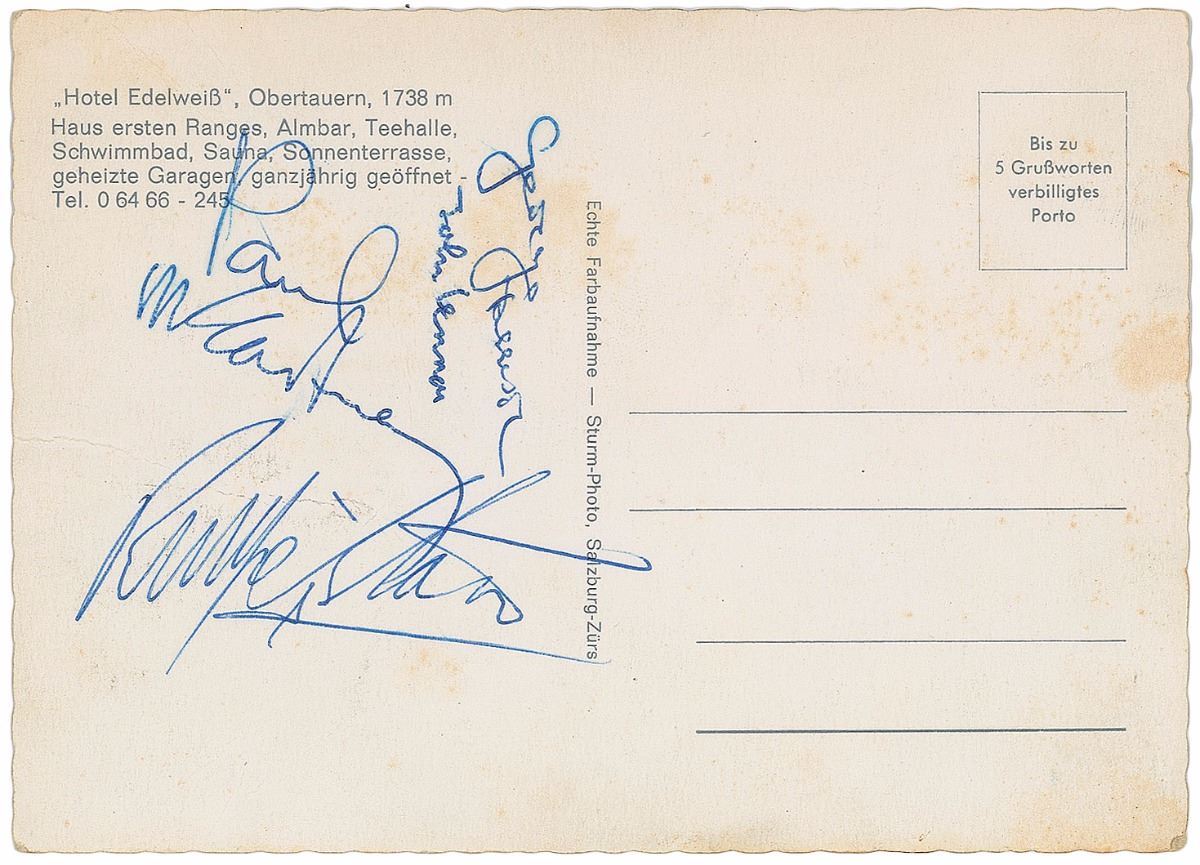 Attractive German postcard showing Hotel Eidelweiss in Obertauern, Austria, 5.75 x 4.25, signed on the reverse in blue ballpoint by George Harrison, John Lennon, Paul McCartney, and Ringo Starr. In very good to fine condition, with light staining and creasing (more noticeable on the the picture side of the postcard). Consignor notes that the signatures were obtained at the Austrian hotel between March 14–20, 1965, while the band were shooting scenes for their second feature film, Help! Accompanied by a copy of a Hotel Eidelweiss receipt from the original recipient.