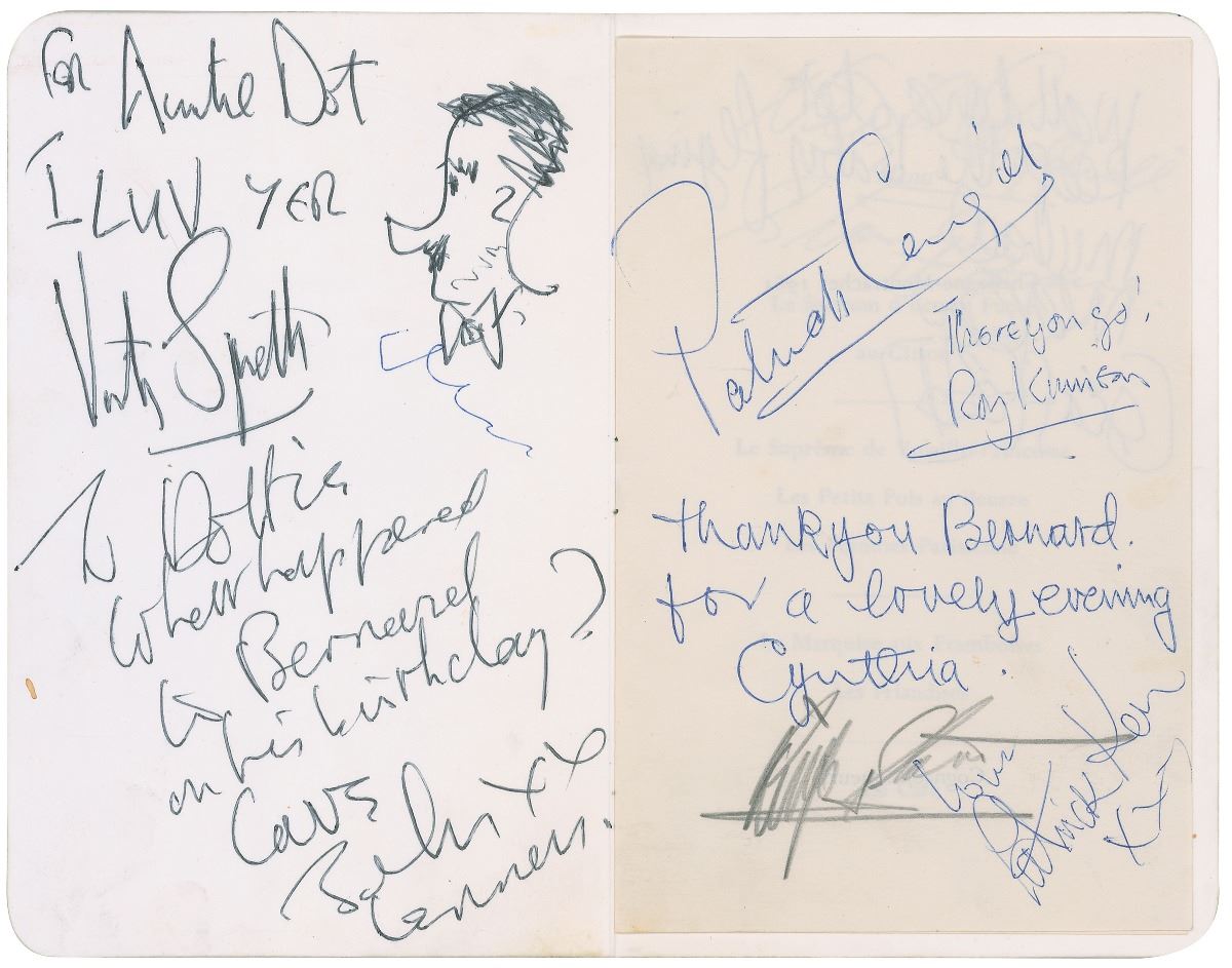 Original 4.5 x 7 menu for the supper party following the Royal World Premiere of Help!, held at the Dorchester Hotel on July 29, 1965. Signed on the front cover in blue ballpoint, “George Harrison” and “Pattie Boyd,” and in pencil “Paul McCartney” and “Jane Asher”; signed and inscribed in black ballpoint on the inside front cover, “To Dottie, what happened to Bernard on his birthday? Love, John Lennon xx,” and “For Aunt Dot I luv yer, Victor Spinetti,” adding a self-caricature next to his signature; signed on the adjacent opening page in pencil, “Ringo Starr,” and in blue ballpoint, “Thank you Bernard for a lovely evening, Cynthia,” “Love, Patrick Kerr,” “Patrick Cargill,” and “There you go! Roy Kinnear!”; and signed on the following page, “Neil Aspinall, Stanley that me,” with an arrow pointing to the word lemon on the menu, and additionally signed and inscribed by one other on the reverse of the first page. In fine condition.