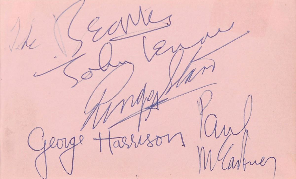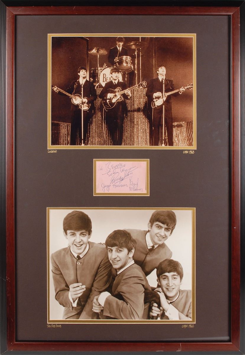 Vintage ballpoint signatures, “The Beatles, John Lennon,” “Ringo Starr,” “George Harrison,” and “Paul McCartney,” on a pink 4.5 x 2.75 album page. Double-matted and framed with two large photos of the Fab Four to an overall size of 22.75 x 32.75. In fine condition, with light creasing and a rectangular area of toning in the upper right corner. Accompanied by a full letter of authenticity from JSA.
