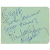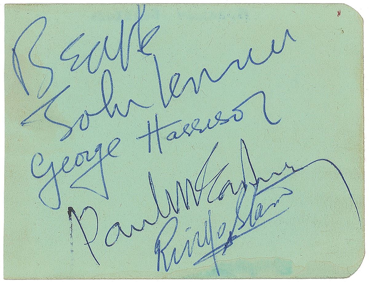 Vintage blue ballpoint signatures, “Beatle, John Lennon,” “George Harrison,” “Paul McCartney,” and “Ringo Starr,” on a light green 4 x 3 album page. In fine condition, with a light stain to the lower edge just touching Ringo’s downstroke. Consignor notes that the signatures were obtained on May 11, 1963, at the Imperial Ballroom in Lancashire, England; the group’s debut appearance in the northern industrial town attracted an overcapacity crowd of 2,000 frantic teenagers. A full cast of clean, bold signatures.