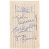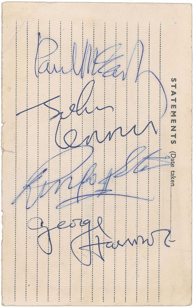 Complete set of ballpoint signatures of Paul McCartney, John Lennon, Ringo Starr, and George Harrison on the reverse of an off-white 3.75 x 6 Leeds City Police Supplementary Statements form. In fine condition, with a small tear to left side of horizontal fold. Consignor notes that the signatures were obtained by an on-duty policeman on either June 5th or November 3rd of 1963, the two dates the Beatles performed at Leeds’ Odeon Cinema in 1963.