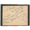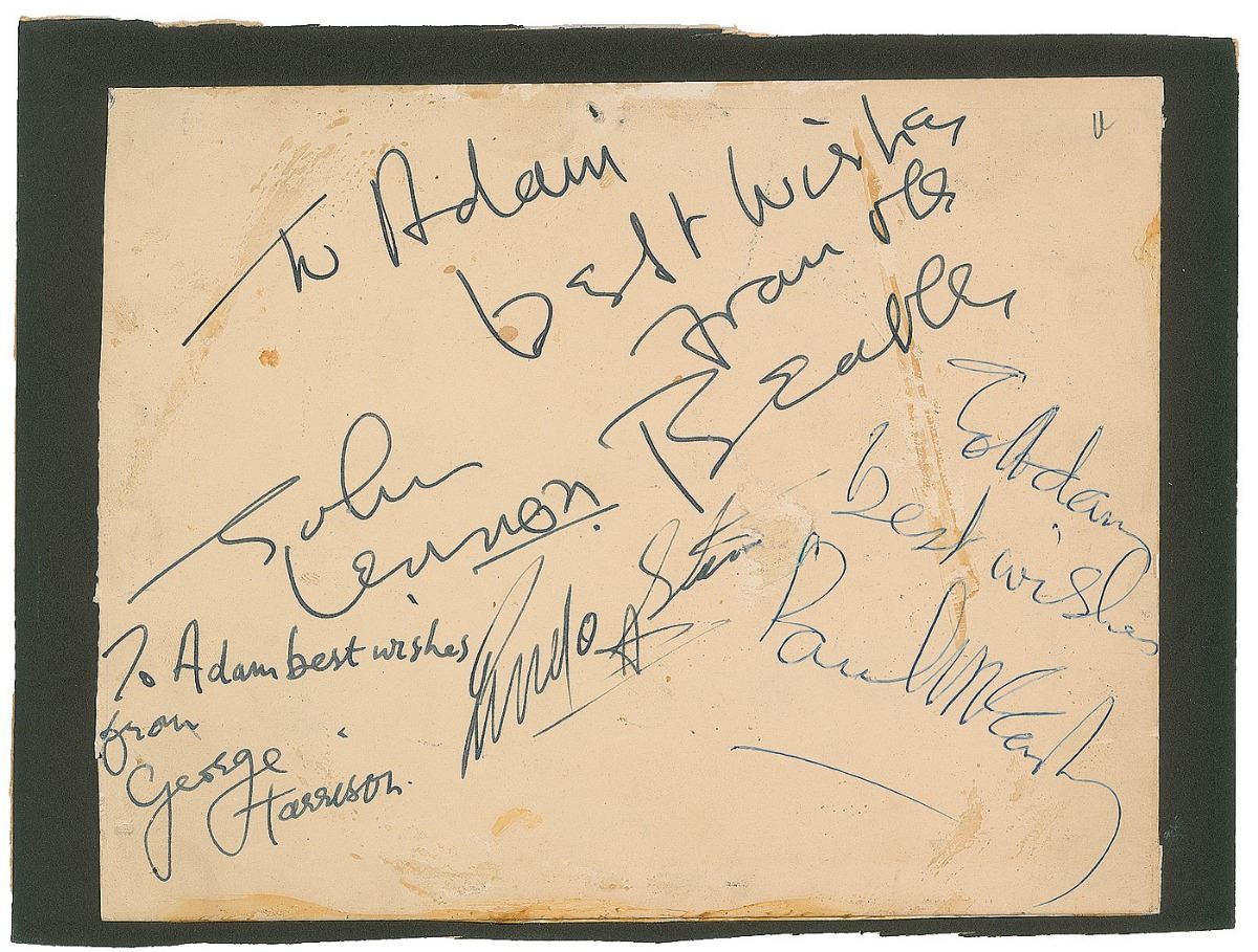Vintage fountain pen signatures and inscriptions, “To Adam, best wishes, from The Beatles, John Lennon,” “To Adam, best wishes, from, George Harrison,” and “Ringo Starr,” and a ballpoint signature and inscription, “To Adam, best wishes, Paul McCartney,” on an off-white 7 x 5.5 sheet affixed to a slightly larger mount. In very good to fine condition, with a tack hole to the top edge, scattered light stains from old adhesive, and a small area of surface loss touching the end of Starr’s signature. Accompanied by an unsigned modern photo of the band.