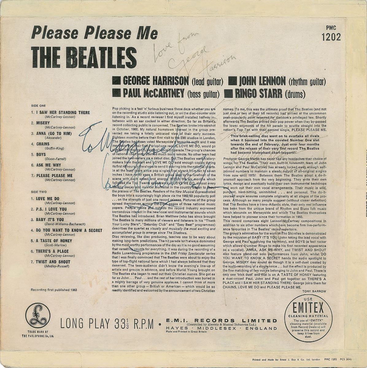 Incredibly desirable 1963 Parlophone mono first pressing Please Please Me album signed and inscribed on the back cover in black ballpoint, "To Margaret, love Paul McCartney, xxx," "Love from, George Harrison," "To Margaret, love from, Ringo Starr, (Richy)," and "John Lennon." In very good to fine condition, with some rippling to the emulsion on the front, light soiling to the reverse, and moderate-to-poor contrast to Lennon and Starr against the textual background. The record is not included. Accompanied by full letters of authenticity from JSA and REAL, as well as a letter of authenticity from noted Beatles expert Frank Caiazzo, in part: "As Ringo's real name was Richard, he was known to those close to him (including the 3 members of The Beatles) as 'Richy.' Therefore Margaret was someone whom Ringo knew very well, and to have him sign 'Richy' is extremely rare, with very few examples known to exist. The signatures on the album date from late 1963 and this is an excellent representative set of Beatles autographs from the period." Seeking to capitalize on the success of their ‘Please Please Me’ and ‘Love Me Do’ singles, the Beatles recorded the majority of this album in a single day and Parlophone rush-released it on March 22, 1963. Before long the Beatles topped the UK charts and took off as an international sensation. A spectacular fully signed example of their first album.