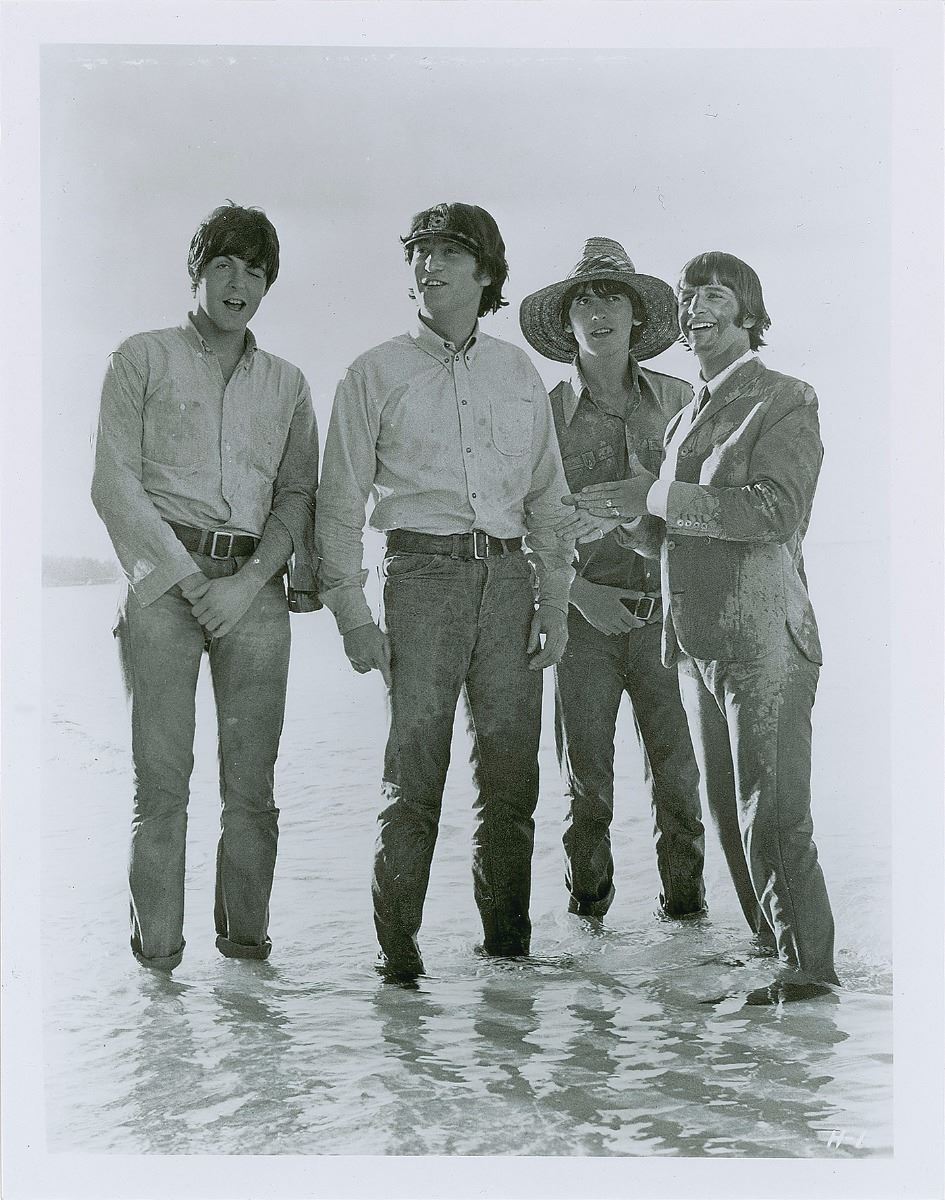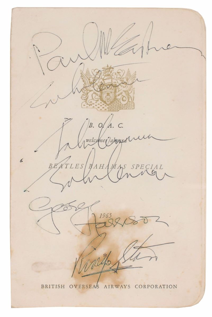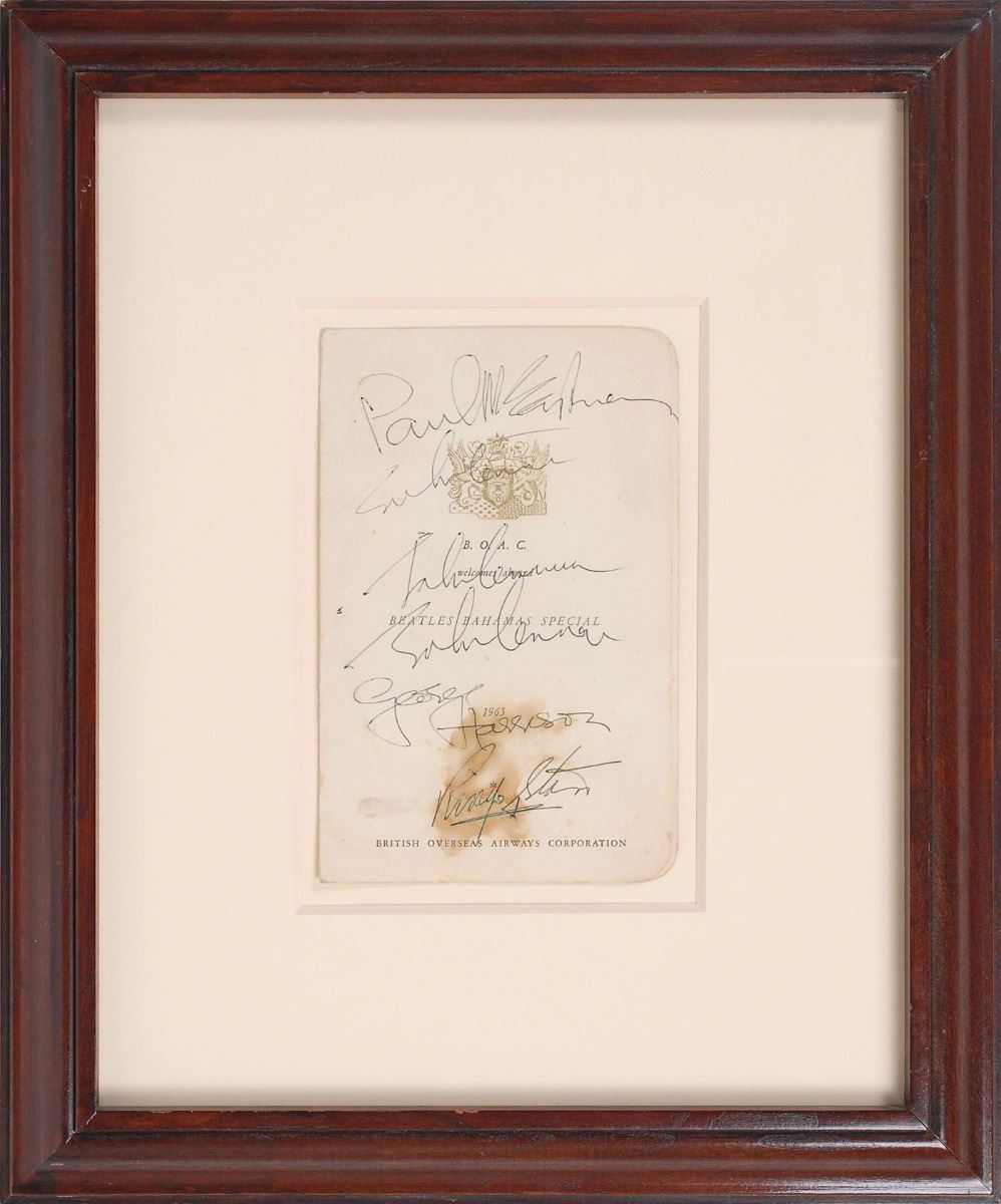 Highly unusual British Overseas Airways Corporation menu from February 1965, reading "B. O. A. C. welcomes aboard Beatles Bahamas Special" on the front cover, 4.5 x 7, signed in black ballpoint by Paul McCartney, George Harrison, and Ringo Starr, and three times by John Lennon. Handsomely archivally mounted on a museum-quality border, matted, and framed to an overall size of 12.75 x 15.25. In very good condition, with a stain touching portions of the Starr and Harrison signatures. Accompanied by a glossy 8 x 10 black and white photo of the Beatles in the Bahamas. Consignor notes that on this particular flight Lennon signed two other individual menus three times each just like this; the example offered here originated from a BOAC stewardess who corroborated this. The Beatles arrived in the Bahamas on February 23, 1965, to shoot the movie Help!, their second feature film. Although it was well received, most critics agreed that it did not live up to its predecessor, A Hard Day's Night. Still, the soundtrack included a handful of the Beatles' greatest hits-'Help!,' 'Ticket to Ride,' and 'Yesterday' among these most popular tracks. A rare piece considering its three Lennon signatures.