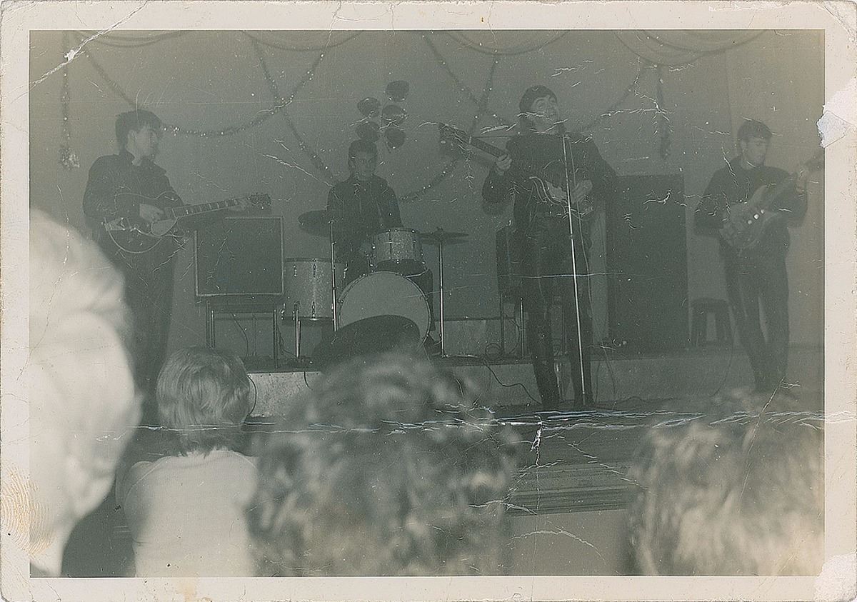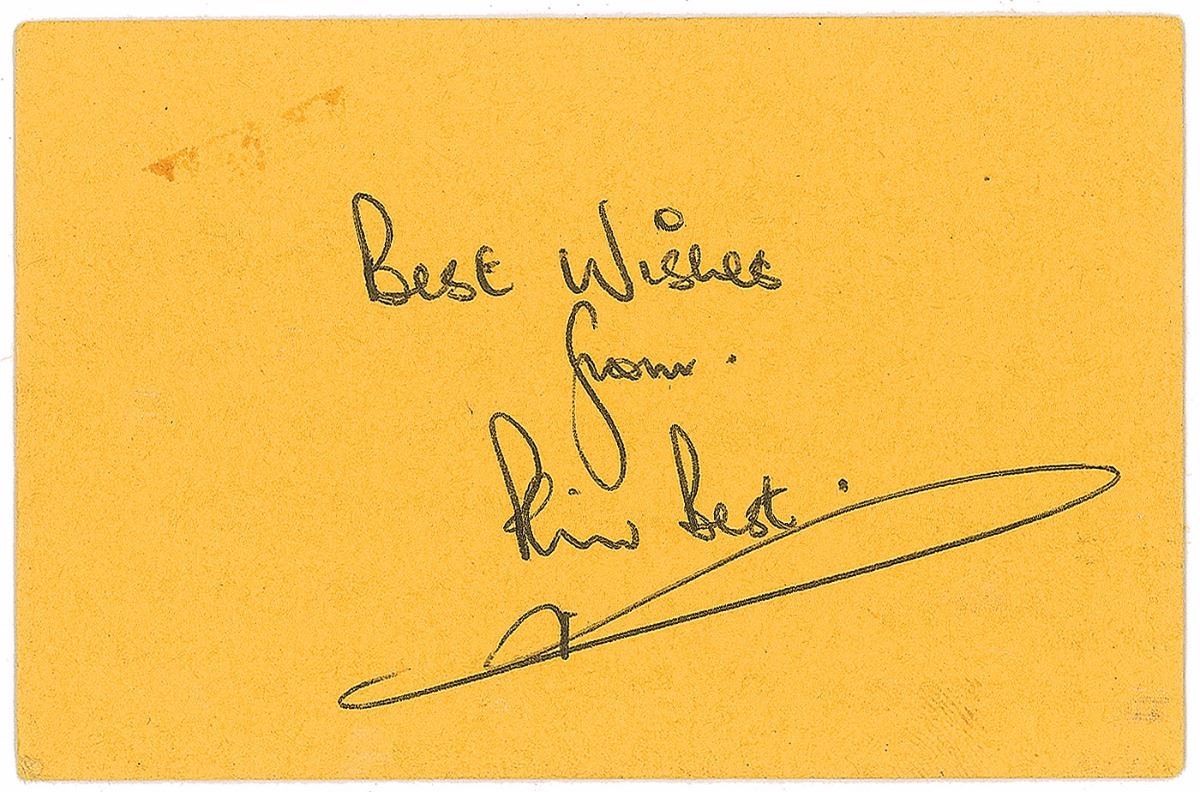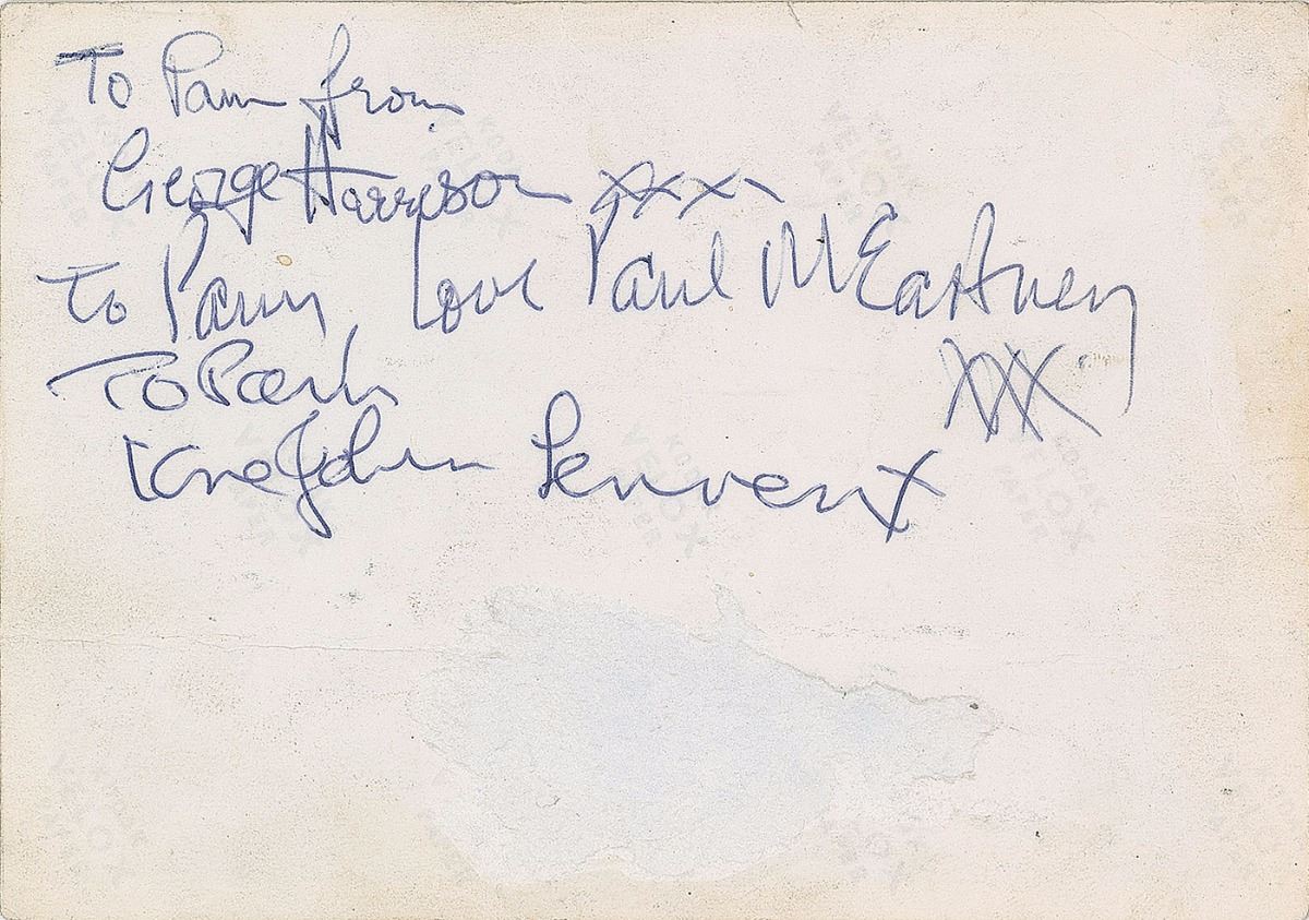 Unique vintage glossy 5 x 3.5 candid photo of the Beatles on stage, with the notable presence of Pete Best on drums, signed and inscribed on the reverse in black ballpoint, "To Pam from, George Harrison, xxxx," "To Pam, Love Paul McCartney, xxx," and "To Pam, love John Lennon, x.” Also includes a ballpoint signature, "Best wishes, from Pete Best," on a yellow 3.5 x 2.25 card. In overall very good condition, with moderate overall creasing, and surface paper loss beneath (and not affecting) the signatures. The Beatles invited Best to join their band on August 12, 1960, on the eve of the group's first Hamburg season of club dates. Under the guidance of manager Brian Epstein, the Beatles replaced Best two years later with Ringo Starr following their first recording session at Abbey Road Studios in London.