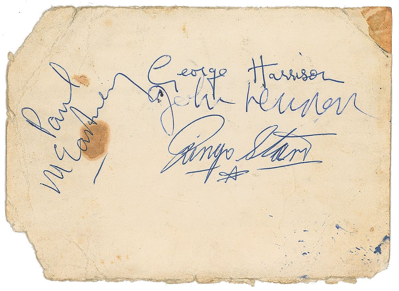 Scarce vintage circa 1962 German Star-Club promo card for the Beatles, 5.75 x 4.25, depicting the band as they prepare to board an airplane, signed on the reverse in blue ballpoint by Paul McCartney, George Harrison, John Lennon, and Ringo Starr. In very good condition, with moderate overall creasing, corner paper loss, and a few stains. Accompanied by a letter of provenance, in part: "The day Beatles 'Love Me Do' single was released in 1962 Benice Task was going to the record shop to purchase the single but found herself too ill to go so she asked her mother Betty Shuff to go for her. On her way to the shop she stopped in a fruit shop that was by her house in Hunts Cross, Liverpool England which George Harrison's mother worked in. Betty Shiff mentioned she was on her way to a record shop for a single of a band she never heard of. Following week Betty Shiff went to the fruit shop to purchase fruit and veg to find that George Harrison's mother handed her a 1962 Star Club promo card autographed by all four Beatle members." Consignor notes that the Beatles signed this card around the same time they were performing at the Star-Club for the final time between November 1–14, 1962, a significant period given that Starr had only been with the band for three months.