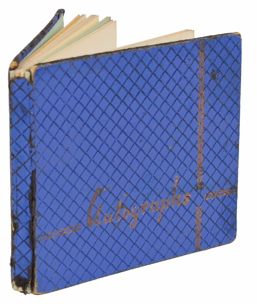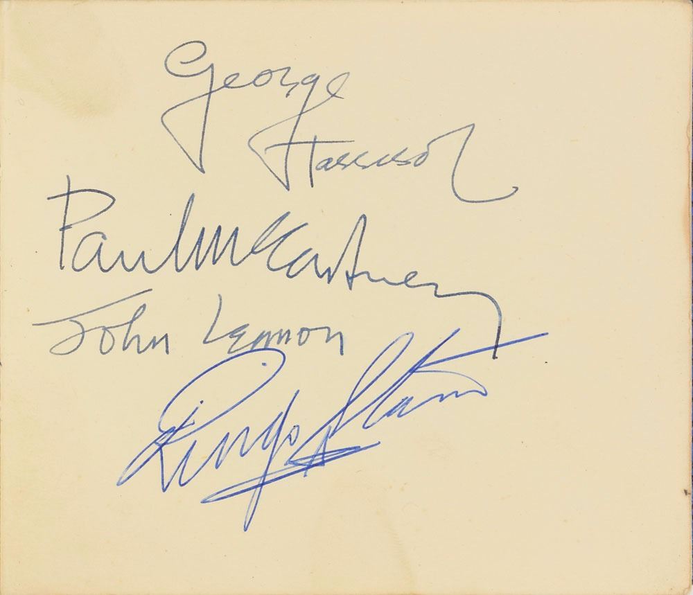 Vintage circa 1963 blue autograph album, 4.75 x 4, neatly signed inside on the same page in black ink by George Harrison, Paul McCartney, and John Lennon, and in blue ballpoint by Ringo Starr. In fine condition, with a couple of light fingerprint smudges to blank areas. A beautiful assemblage of uninscribed autographs from the iconic band.