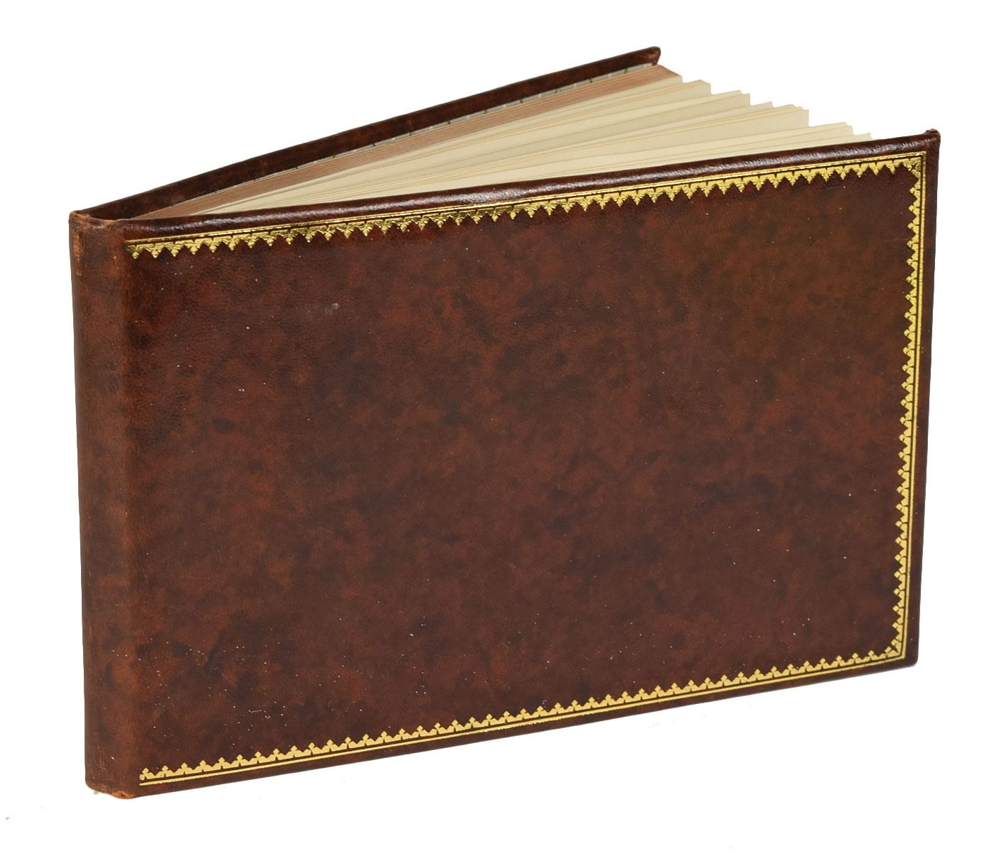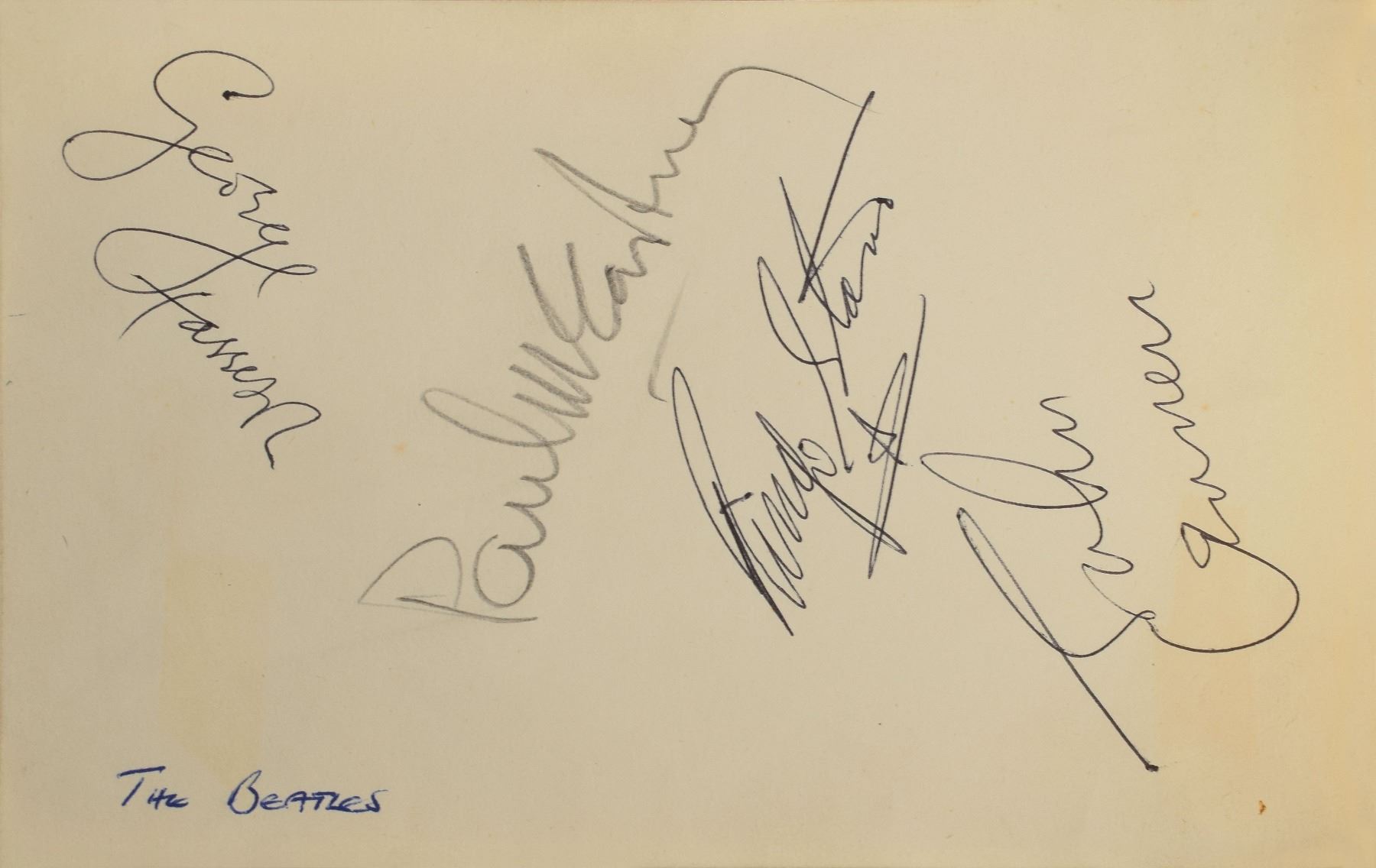 Beautiful vintage gilt-lined leatherbound autograph book, 7.25 x 4.75, signed inside on the same page in black ballpoint by George Harrison, John Lennon, and Ringo Starr, and in pencil by Paul McCartney. In fine condition, with two very faint areas of toning. Accompanied by the autograph book's original box and a certificate of authenticity from Tracks. Consignor notes that the signatures date to late 1963, early 1964.