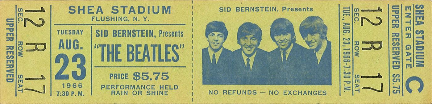 Unused ticket for the Beatles famous concert at Shea Stadium in New York on August 23, 1966, for admission to the upper reserved section. The ticket, measuring 6.25 x 1.5, is issued as Section 12, Row R, and Seat 17, and features an image of the 'Fab Four' on the right side. In fine condition. A choice, complete example for what is considered one of the greatest concerts of all time.