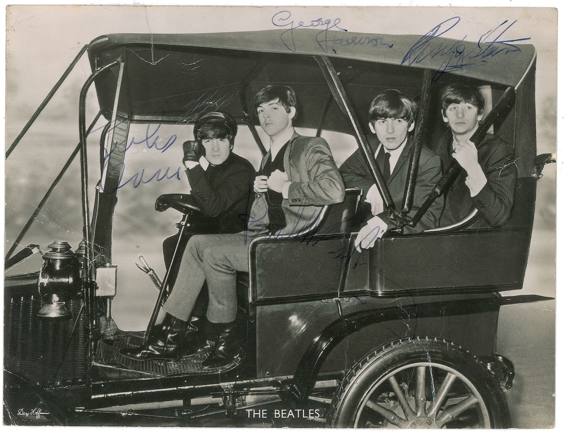 Circa 1964 vintage glossy 8.5 x 6.5 Dezo Hoffman publicity photo of the Beatles seated inside a 1902 Renault automobile, signed in fountain pen by John Lennon, George Harrison, Paul McCartney, and Ringo Starr. In very good condition, with moderate-to-heavy overall creasing, and poor contrast to Paul's signature. An unusual and striking pose of the legendary band, evoking the lyrics of their upbeat 1965 tune ‘Drive My Car’—‘beep beep, beep beep, yeah!’