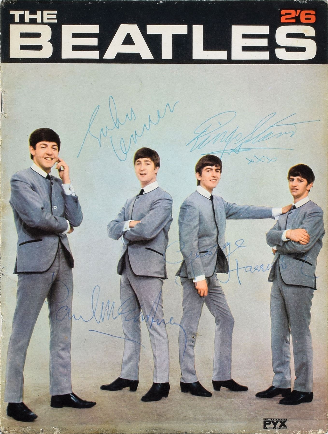 Extremely rare 1963 PYX Productions Limited program for the Beatles, 28 pages, 7.25 x 9.5, signed on the front cover in blue ballpoint, "John Lennon," "Paul McCartney," "George Harrison," and "Ringo Starr, xxx." The front cover features Dezo Hoffman’s iconic photograph of the band in their matching gray collarless suits. In fine condition, with very light handling wear. With iconic Hoffman imagery and a crisp cast of signatures, this is an immensely desirable program signed during the nascent stages of Beatlemania. An ideal autographed piece from the legendary group.