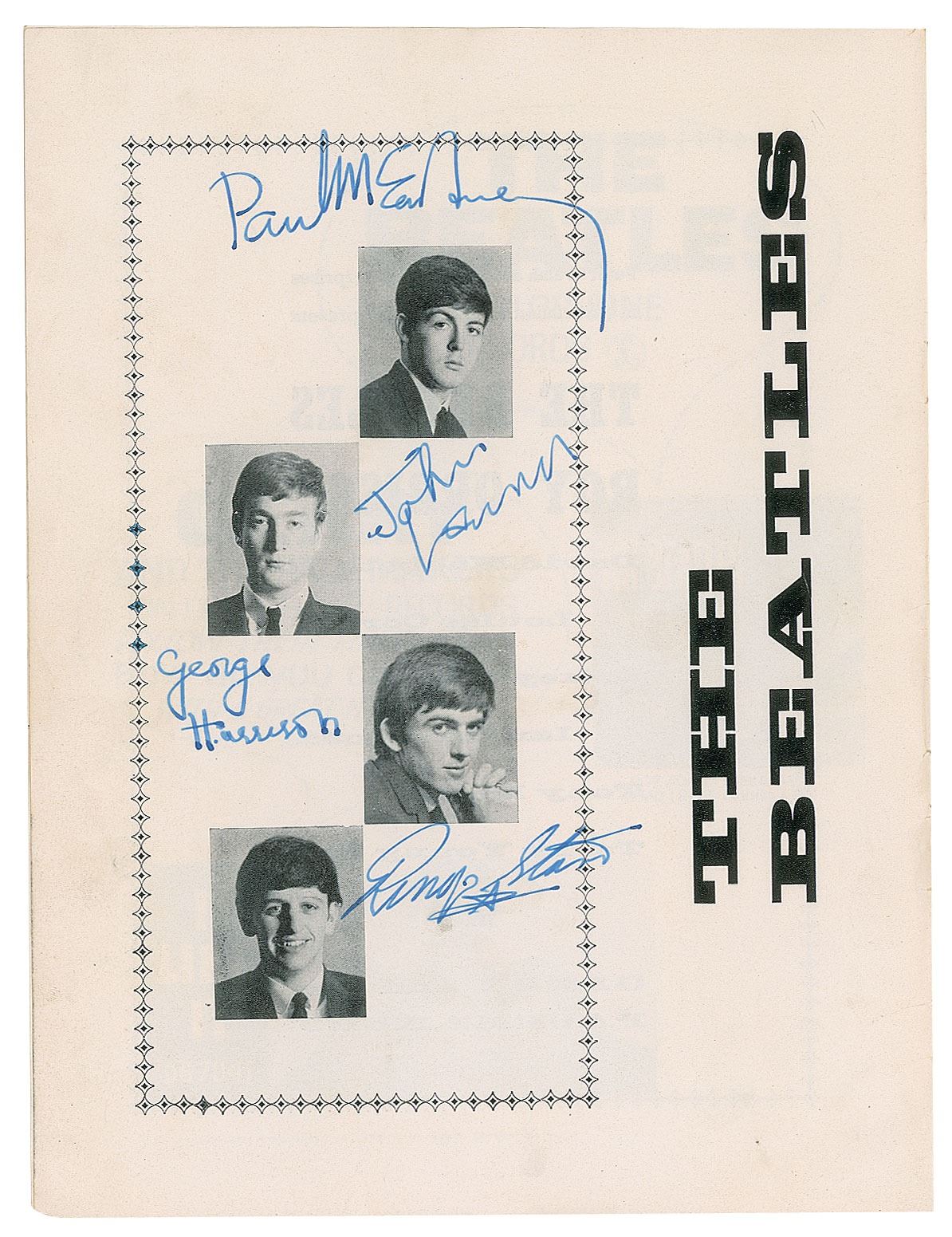 Program for the Beatles' 1963 UK tour with Roy Orbison, 7.75 x 10.25, signed inside by the top-billed performers next to their images in bold fountain pen, "Paul McCartney," "John Lennon," "George Harrison," and "Ringo Starr," and on the following page, "Sincerely, Roy Orbison." In very good condition, with overall creasing and handling wear. Consignor notes that the autographs were obtained in person at the Brighton Hippodrome on June 2, 1963. Although Orbison was originally scheduled to be the headline act, the public's reaction to the Beatles tour resulted in them being co-headliners, with the Beatles closing the set in the traditional headlining spot. A hugely desirable, early piece of Beatlemania.