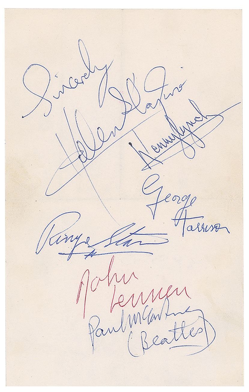 Vintage circa early 1963 blue ballpoint signatures, "George Harrison," "Ringo Starr," and "Paul McCartney (Beatles)," and a red ballpoint signature, "John Lennon," on an off-white 5 x 8 sheet, which is also signed by Helen Shapiro and Kenny Lynch. In very good to fine condition, with light creasing and intersecting folds. Accompanied by a letter of provenance: "This is a set of Beatles autographs that my uncle got for me in February 1963 when the group played at the Granada cinema/theatre in Mansfield, Nottinghamshire. The Beatles were on a UK tour with Helen Shapiro. My uncle did a lot of work with the Granada and was backstage at this event. He brought home the autographs as a special present for me." Consignor notes that the autographs were obtained at the Granada Cinema in Mansfield, Nottinghamshire, England on February 23, 1963, the opening night of the second leg of the Helen Shapiro UK tour, which featured both the Beatles and Kenny Lynch as supporting acts. Before going on stage, the Beatles crowded into Helen’s dressing room to watch their latest appearance on ‘Thank Your Lucky Stars,’ which they had taped the previous Sunday. Accompanied by a certificate of authenticity from Tracks.