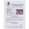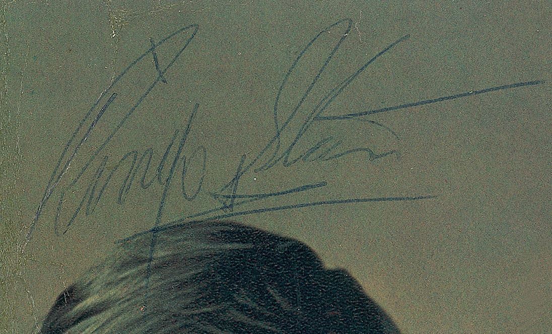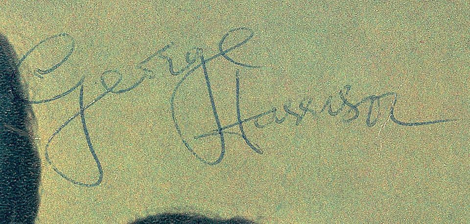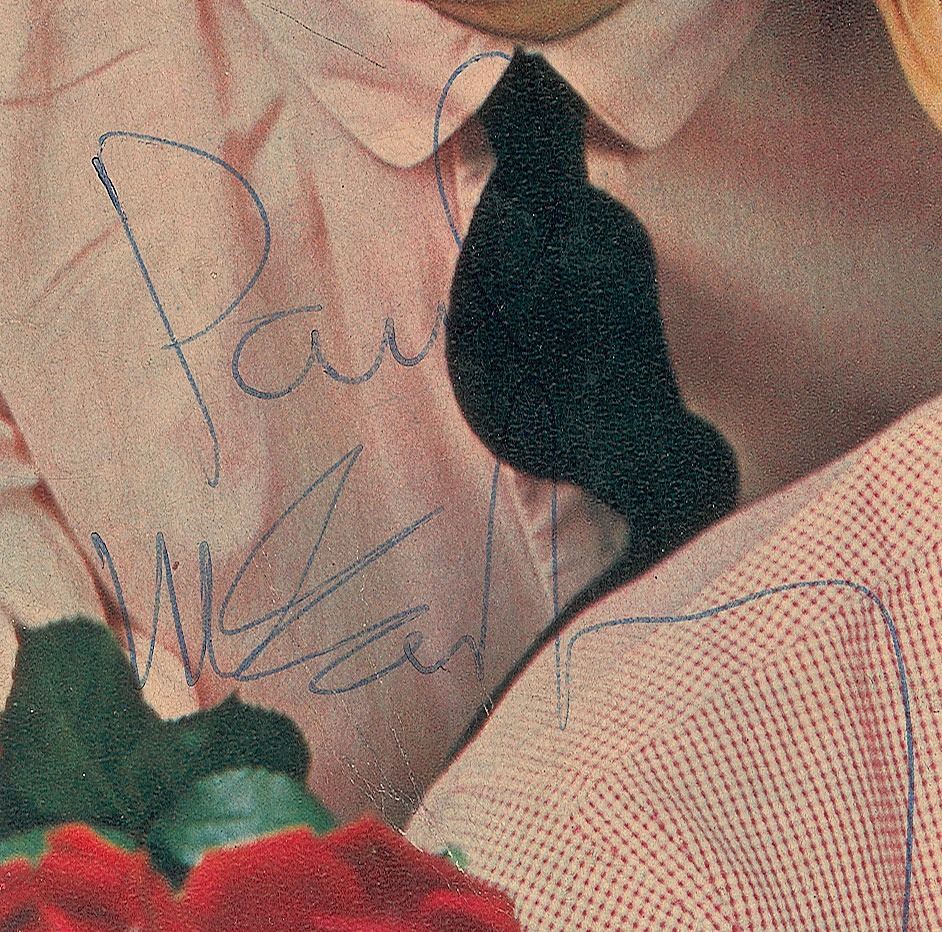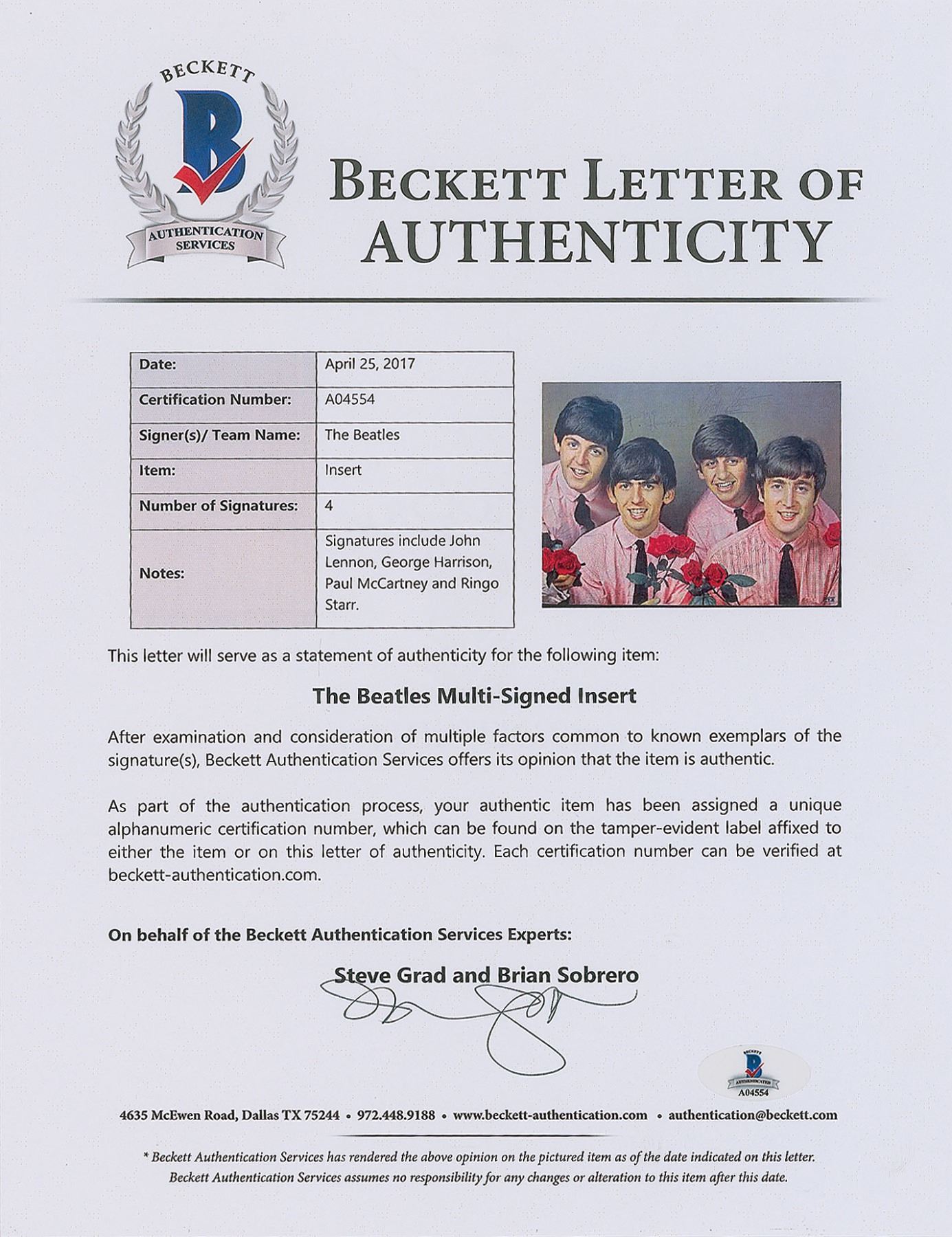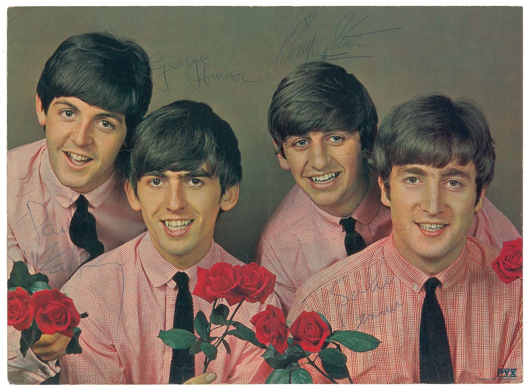 Extremely desirable oversized color 12.25 x 9 PYX cardstock promo photo of the Beatles holding roses and dressed in matching red plaid shirts, signed in blue ballpoint by John Lennon, Paul McCartney, George Harrison, and Ringo Starr. In very good condition, with overall creasing, and a central vertical fold which is reinforced with archival tape on the back. A simply fantastic, rarely seen color image of the band, enhanced by its large size and absence of any dedications. Accompanied by a full letter of authenticity from Beckett Authentication Services.