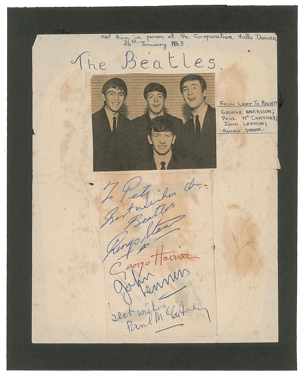 Vintage ballpoint signatures and inscription, “To Pete, Best wishes the Beatles, Ringo Starr,” “George Harrison,” “John Lennon,” and “best wishes, Paul McCartney,” on an off-white 3 x 4.5 sheet affixed to a larger album page with collector’s notations, which read: “Met them in person at the Co-operative Halls Darwen, 26th January 1963.” The album page is affixed to a black 7.75 x 9.75 paperstock mount. In very good condition, with a tear to the upper left blank area, overall creasing, and staining from mounting. Accompanied by a detailed letter of provenance from the original recipient, as well as a certificate of authenticity from Tracks.