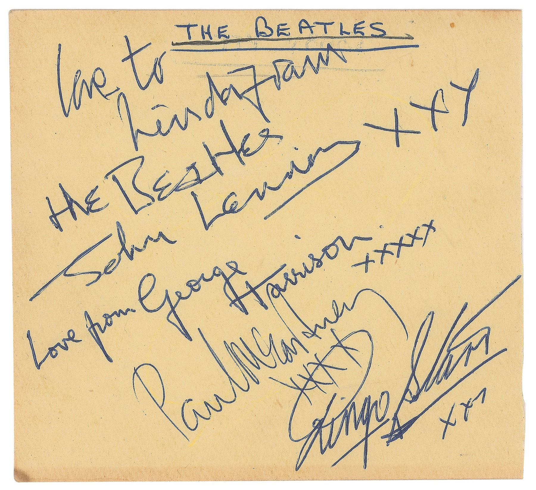 Bold vintage cast of ballpoint signatures with inscription, “Love to Linda, from the Beatles, John Lennon, xxx,” “Love from George Harrison, xxxxx,” “Paul McCartney, xxxx,” and “Ringo Starr, xxx,” on a yellow 4 x 3.75 album page. Consignor notes that the autographs date to 1963. In fine condition. Accompanied by a certificate of authenticity from Tracks.