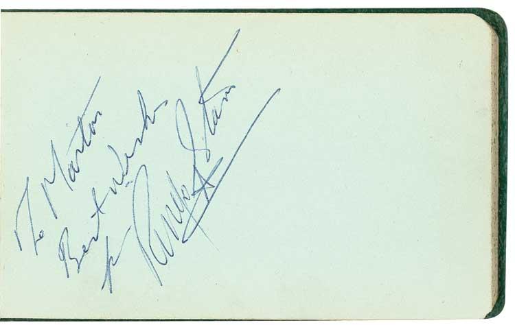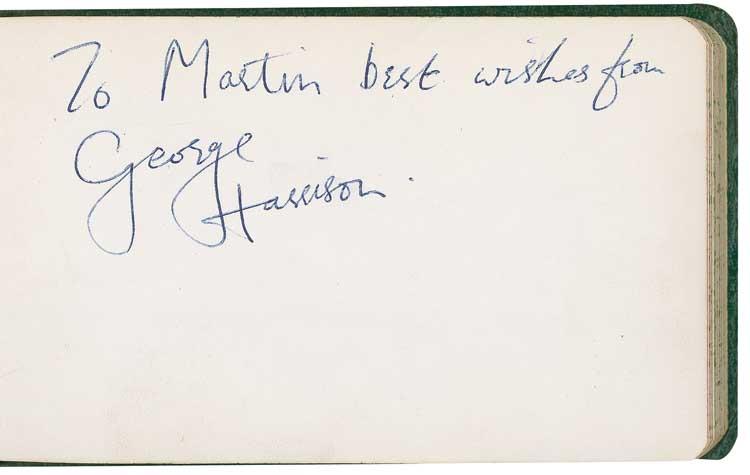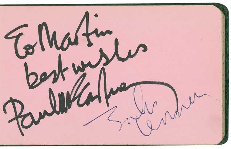 Vintage ballpoint signatures and inscriptions, “To Martin, Best wishes, Ringo Starr,” “John Lennon,” “To Martin, best wishes from George Harrison,” and a felt tip signature and inscription, “To Martin, best wishes, Paul McCartney,” on three colored 5.5 x 3.25 album pages, with McCartney’s and Lennon’s signatures residing on the same page. All three are still housed in their original hardcover autograph album. In fine condition. Pre-certified Roger Epperson/REAL and RRAuction COA.