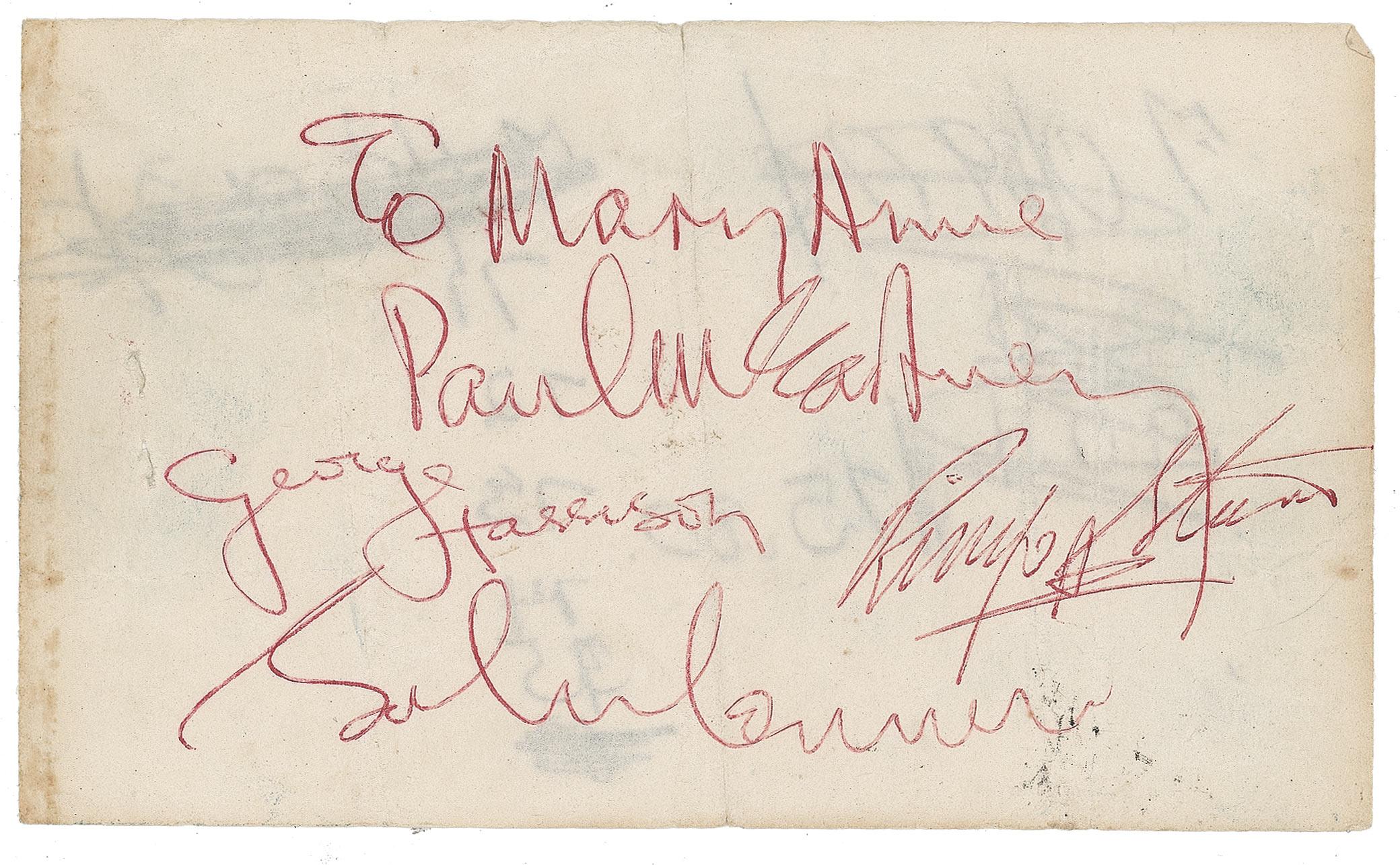 Vintage ballpoint signatures and inscription, “To Mary Anne, Paul McCartney,” “George Harrison,” “Ringo Starr,” and “John Lennon,” on an off-white 5 x 3 slip. Consignor indicates the signatures were originally obtained by her father, a Pan Am airline mechanic, when the Beatles came to Boston, Massachusetts. Once the plane landed, he went on board and obtained the signatures on a slip he was compiling a receipt upon. In very good condition, with light overall creasing and wrinkling, with three vertical folds lightly affecting a few letters of signature, staple hole to left side, and some light border toning. Pre-certified Roger Epperson/REAL and RRAuction COA.