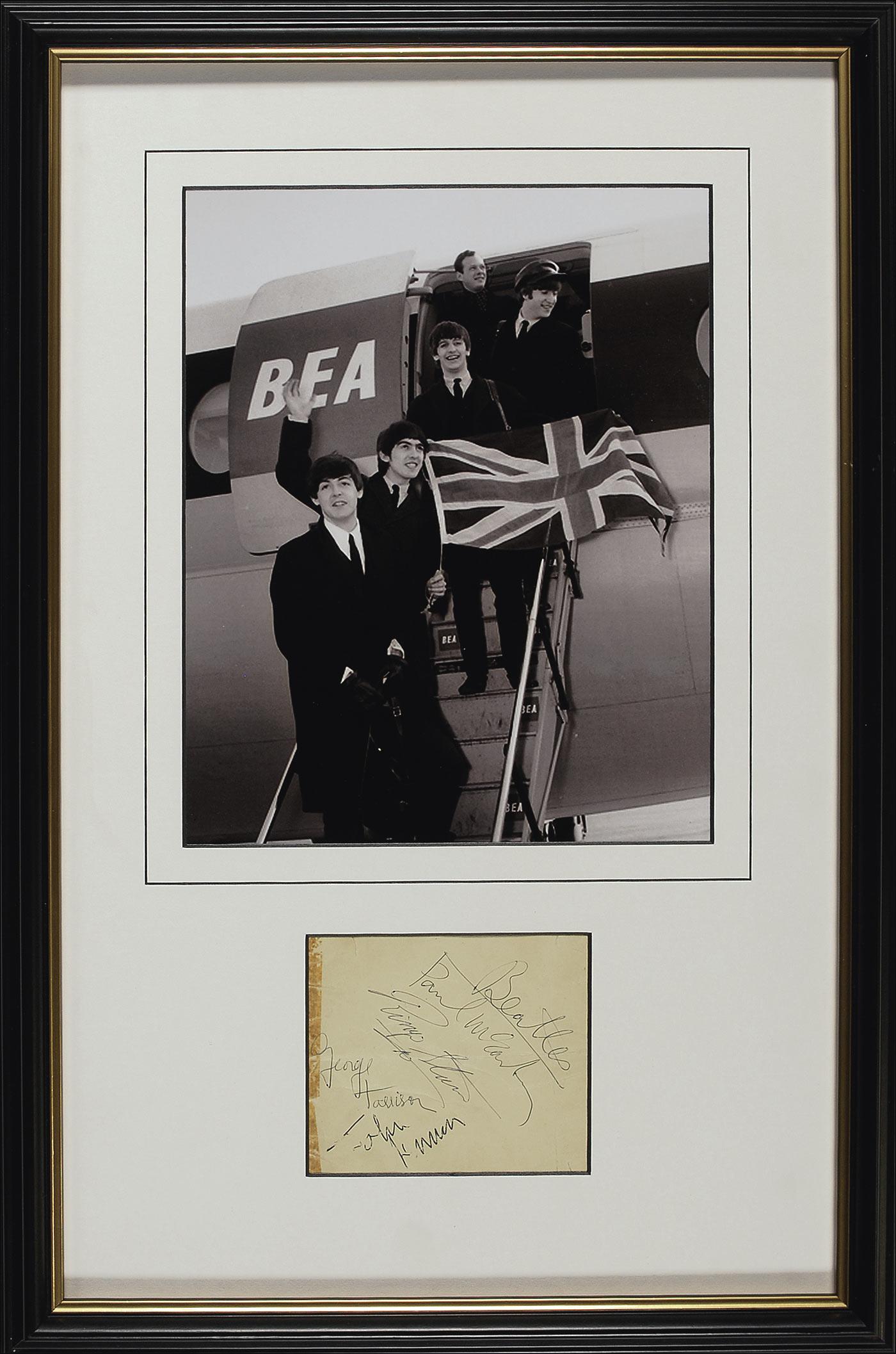 Vintage ballpoint signatures, “Beatles, Paul McCartney,” “Ringo Starr,” “George Harrison,” and “John Lennon,” on a light yellow album page. Matted and framed with a photo of the Fab Four exiting their airplane, to an overall size of 13.25 x 20.5. Moderate intersecting folds and creases passing through all signatures, old tape toning along left edge affecting first stroke of Harrison’s signature, and some skipping to Lennon’s signature, otherwise very good condition. Accompanied by a letter of provenance from the original recipient of the signatures, who acquired them by sneaking backstage in between shows at the Coventry Theatre on February 24, 1963: “We were in luck all the way along and through another door into backstage. Immediately in front of us there they stood talking to Kenny Lynch, The Beatles themselves. They had seen us come out of the door so we went up to them and started to talk to them. We asked for their autographs which they gave to us.”
