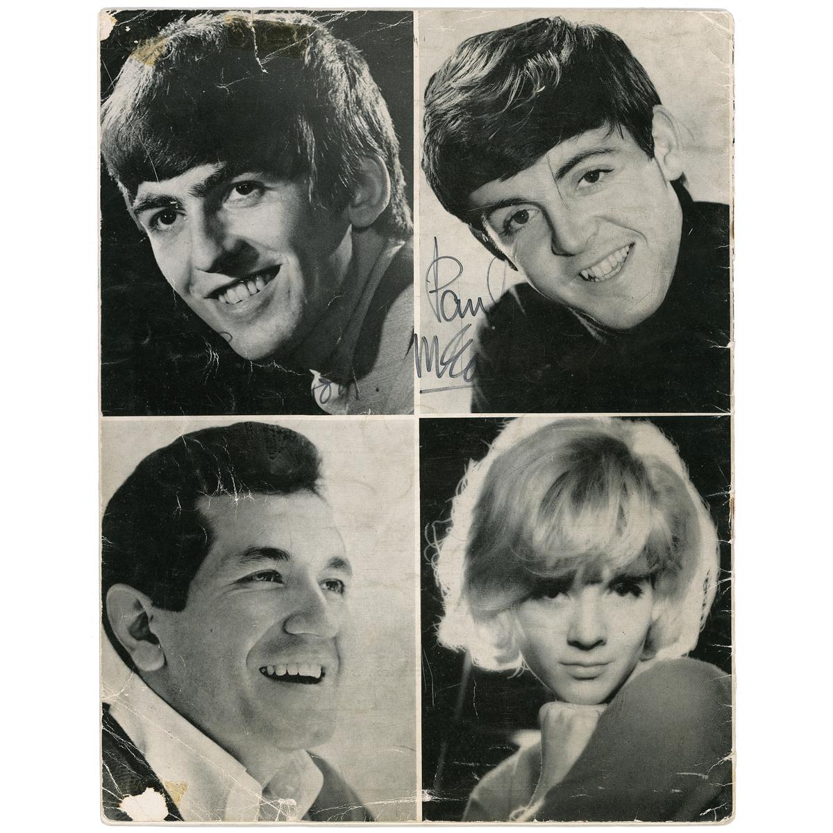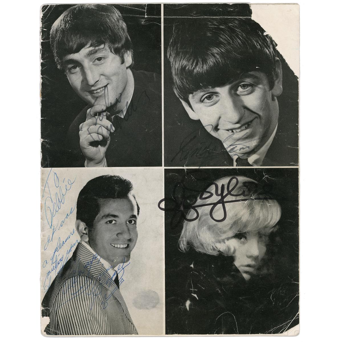 Original vintage program from the Beatles engagement at the Olympia Theatre in Paris, 9.5 x 12, signed on the front cover in black felt tip over their images by John Lennon and Ringo Starr, and on the back cover over their images by Paul McCartney and George Harrison. Also signed on the front cover in black felt tip by Sylvie Vartan, and signed and inscribed on the front cover in blue ballpoint by Trini Lopez. In good condition, with poor contrast to Harrison’s signature, remaining signatures light but still legible, partial separation of front cover along hinge, missing top right corner of front cover, scattered creasing and handling wear throughout, some old tape remnants inside, as well as some light soiling. The signatures of Lennon, McCartney, and Starr are bold and readable, and each has been authenticated by Roger Epperson. However, Harrison's signature, while signed in the same ink and likely signed at the same time as the others, exhibits very poor contrast against the dark background and Roger Epperson is unable to make a conclusive judgment on it.