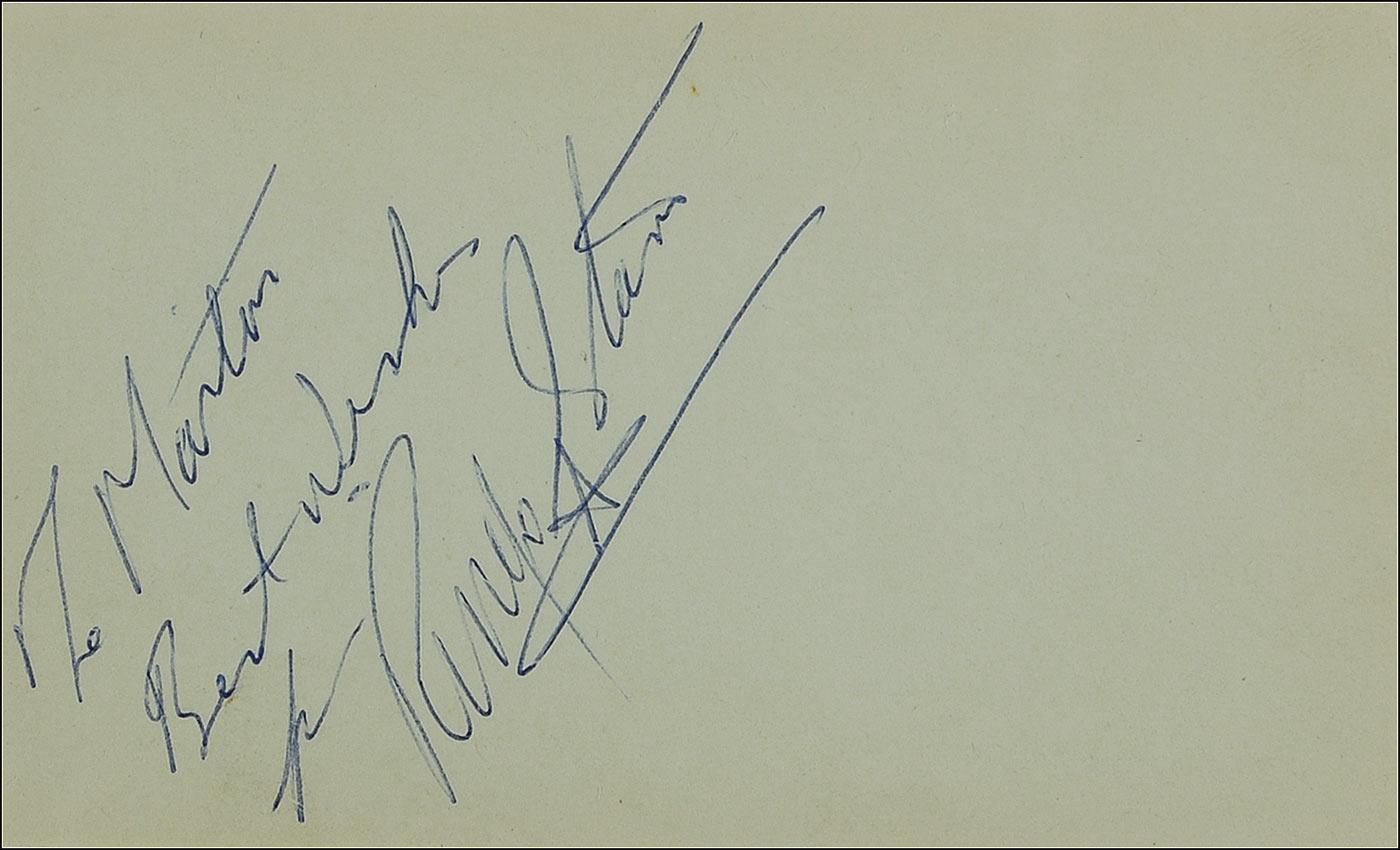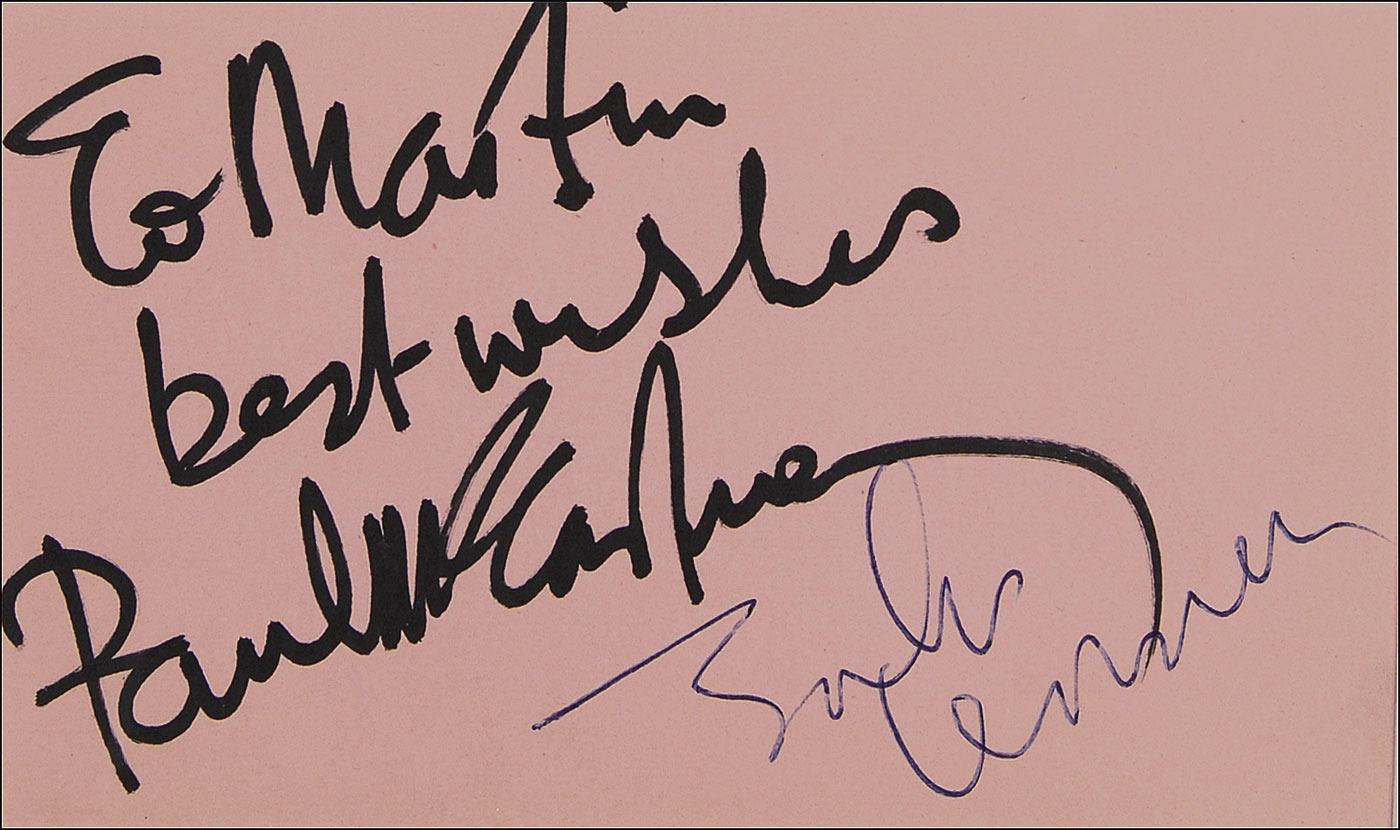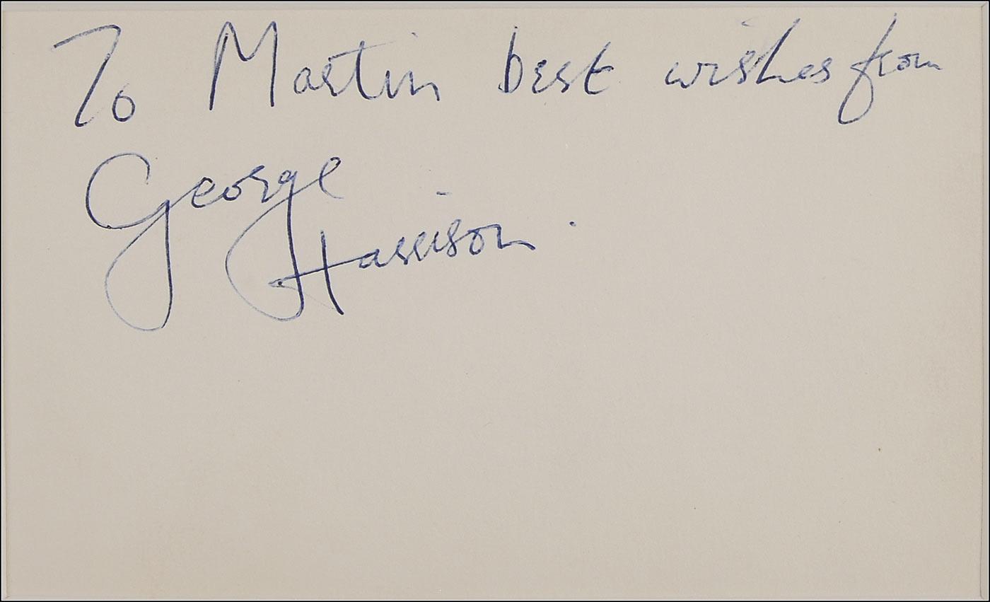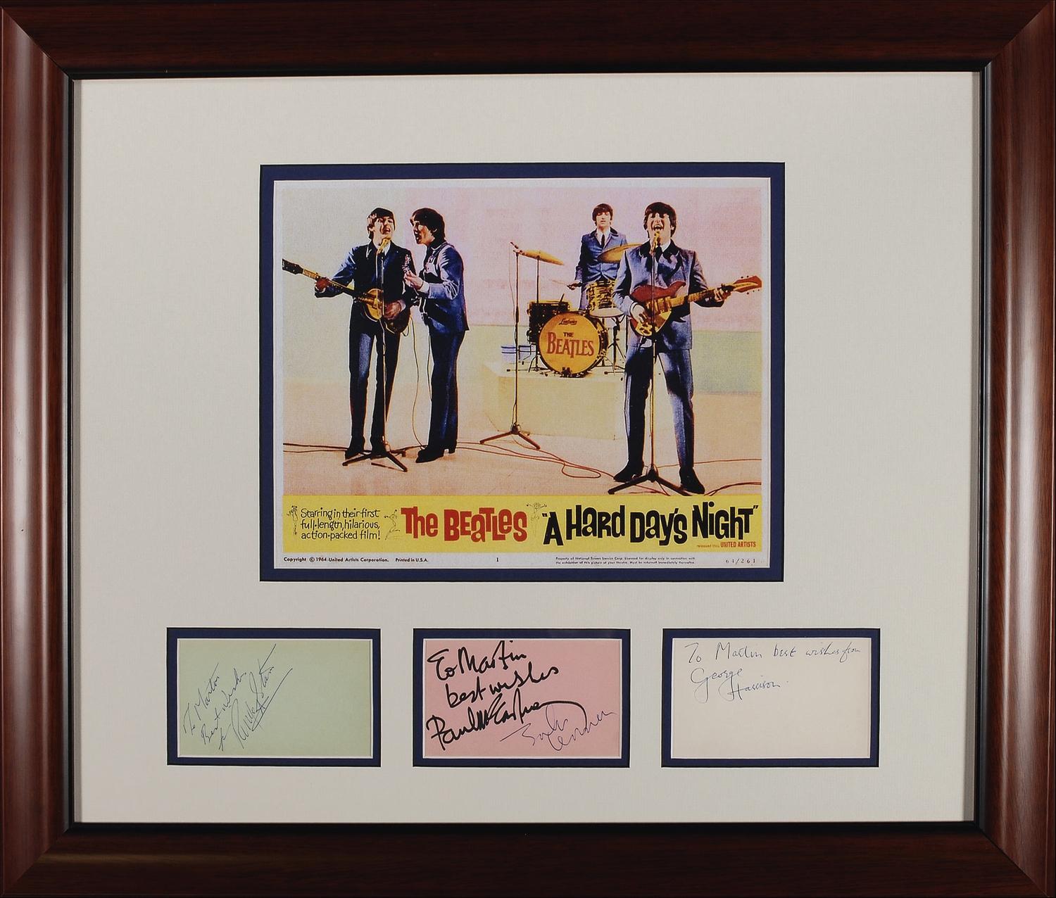 Complete set of Beatles signatures and inscriptions on three 5 x 3.25 pages, as follows: “To Martin, Best Wishes, Ringo Starr” on a green card; “To Martin, best wishes, Paul McCartney” and “John Lennon” on a pink card; and “To Martin, best wishes from George Harrison” on a white card. All three cards are matted with a copy of A Hard Day’s Night lobby card and framed to an overall size of 28 x 24. In fine condition. An attractive presentation of this increasingly difficult-to-assemble grouping! Oversized.