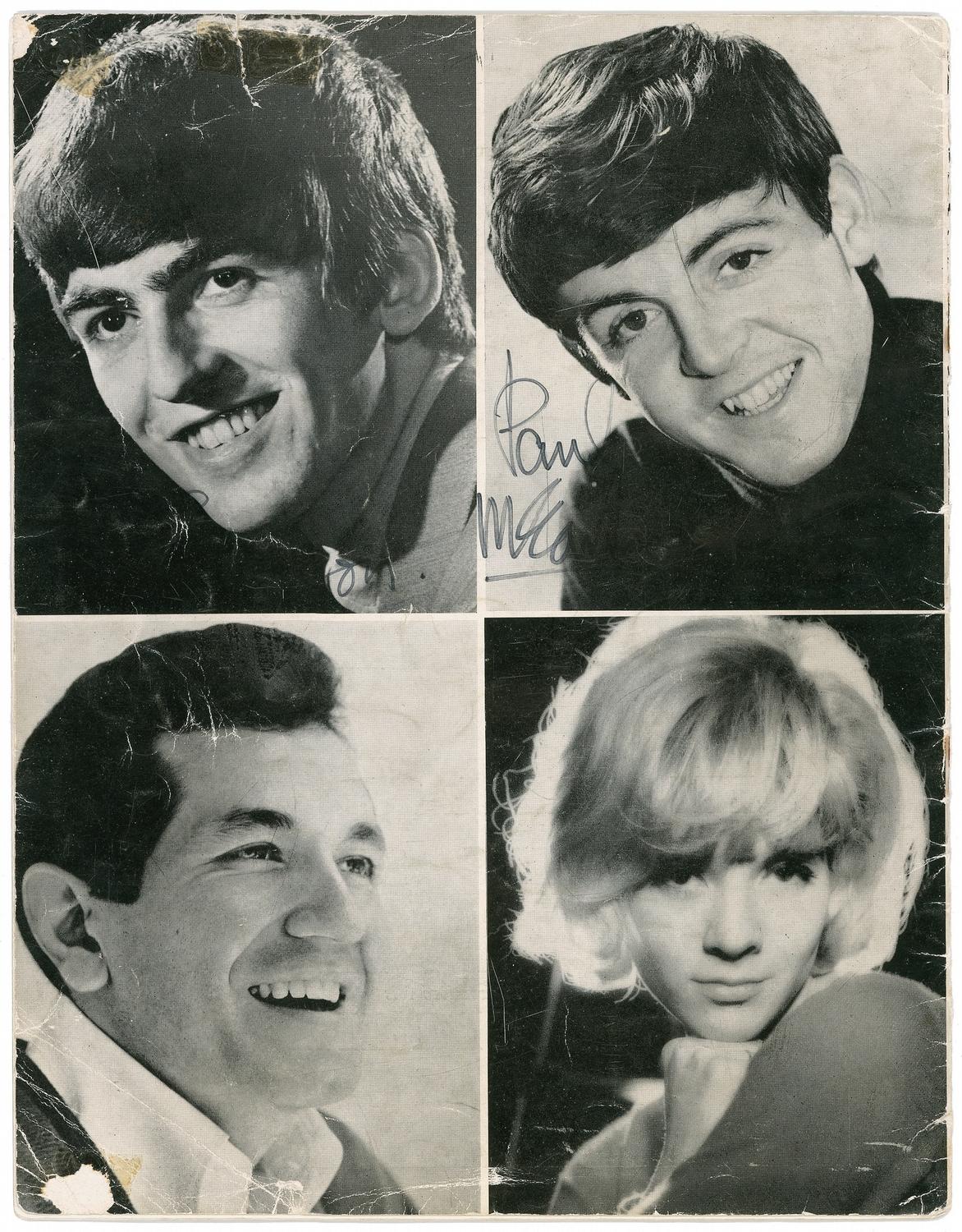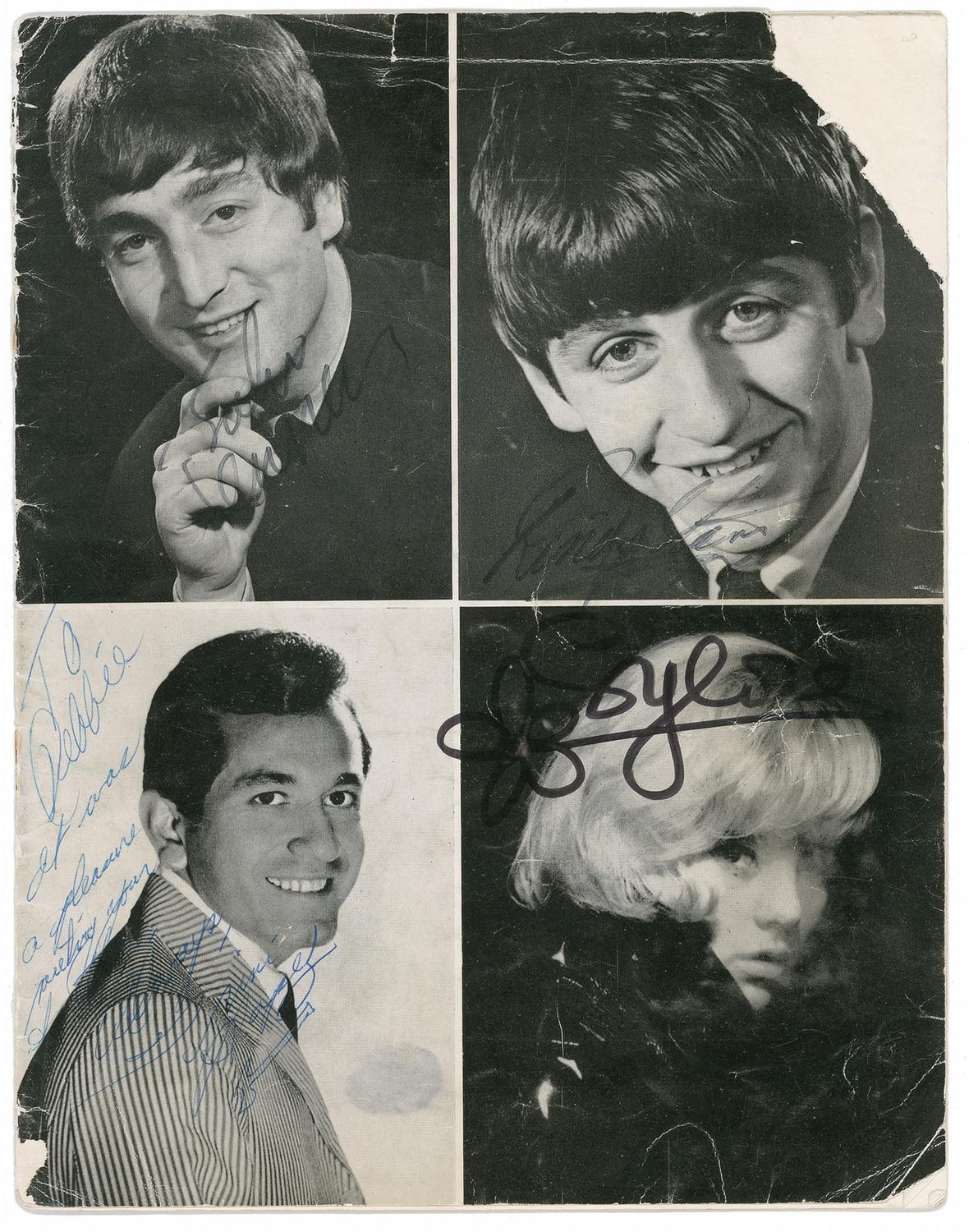 Original vintage program from the Beatles engagement at the Olympia Theatre in Paris, 9.5 x 12, signed on the front cover in black felt tip over their images by John Lennon and Ringo Starr, and on the back cover over their images by Paul McCartney and George Harrison. Also signed on the front cover in black felt tip by Sylvie Vartan, and signed and inscribed on the front cover in blue ballpoint by Trini Lopez. In good condition, with poor contrast to Harrison’s signature, remaining signatures light but still legible, partial separation of front cover along hinge, missing top right corner of front cover, scattered creasing and handling wear throughout, some old tape remnants inside, as well as some light soiling. The signatures of Lennon, McCartney, and Starr are bold and readable, and each has been authenticated by Roger Epperson. However, Harrison's signature, while signed in the same ink and likely signed at the same time as the others, exhibits very poor contrast against the dark background and Roger Epperson is unable to make a conclusive judgment on it. Beginning January 16, 1964, the Beatles began an 18-day stint at Paris' Olympia Theatre as part of a nine-act bill, playing two and sometimes three sets each day. Songs included ‘From Me To You,’ ‘Roll Over Beethoven,’ ‘She Loves You,’ ‘I Want To Hold Your Hand,’ ‘Twist And Shout,’ and ‘Long Tall Sally,’ with some tunes cut out as part of an abbreviated matinee. The regal performance hall was somewhat ill-equipped for the Fab Four, with the band’s amplifiers blowing the theater’s fuses three separate times during their second show. During that same performance, a mob of French photographers backstage became embroiled in a fist fight that spilled onto the stage, resulting in a stoppage of the concert and forcing John, Paul, George, and Ringo from the theater. Such drama aside, the Beatles closed each performance, but shared top billing at various times with Lopez and Vartan, a French singer. The original recipient of this program was Gilbert Miller, a fellow performer who shared the bill during that Paris event, which took place just prior to the Beatles’ legendary appearance with Ed Sullivan on TV. Miller, who later became a talent agent, offered the Beatles and their manager advice on performing before an American audience. He also had the band sign this Olympia Theatre program for his 11-year-old daughter. Accompanied by a notarized letter from Miller as well as a 2004 Las Vegas magazine that carried an article on Miller and his Beatles encounter.