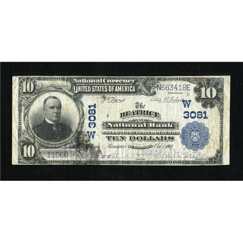 <B>Beatrice, NE</B></I> - $10 1902 Plain Back Fr. 624 <B>The Beatrice NB</B></I> Ch. # (W)3081<BR>This scarce Gage County note is solid <B>Fine-Very Fine</B></I> overall, but there is a little minor soiling on the face side. The blue stamped signatures are still bold and clear.<BR><BR><b>Shipping:</b> Coins & Currency (<a target="_blank" href="http://www.heritageauctions.com/common/shipping.php">view shipping information</a>)