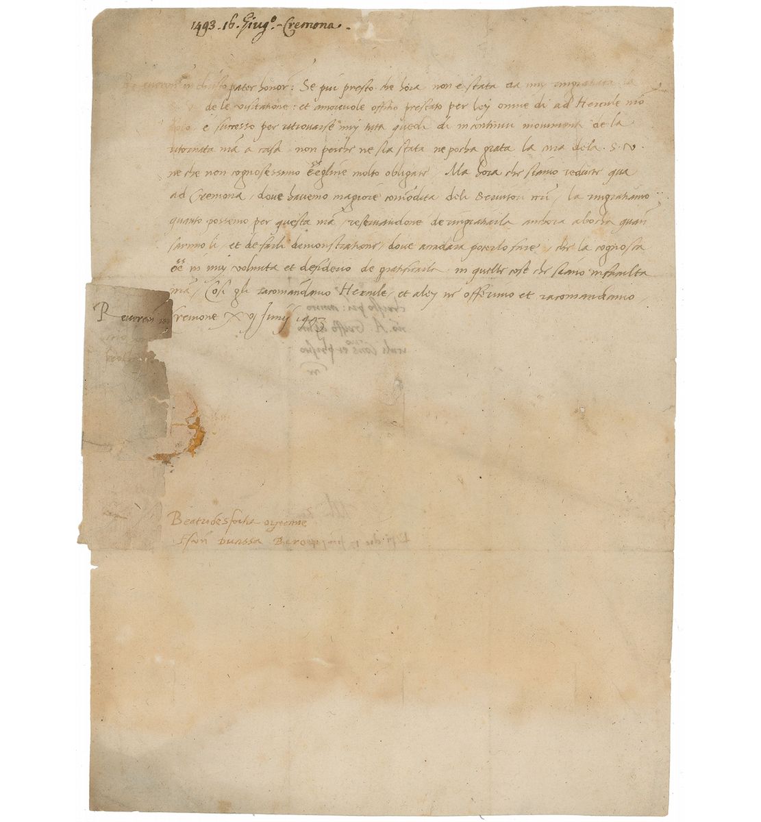 Duchess of Bari and later of Milan (1475–1497) who was the wife of the Milanese ruler Ludovico Sforza. LS in Italian, signed “Beatrudes,” one page, 8.25 x 11.25, 1493. Crisply-penned untranslated letter, signed along the bottom edge by Beatrice. Letter has been professionally silked on the reverse and has been encapsulated in Mylar. In very good condition, with intersecting folds, scattered light toning and soiling, light show-through from docketing on reverse, and several repaired areas of paper loss. An incredibly scarce offering of one of the most beautiful and accomplished princesses of the Italian Renaissance.
