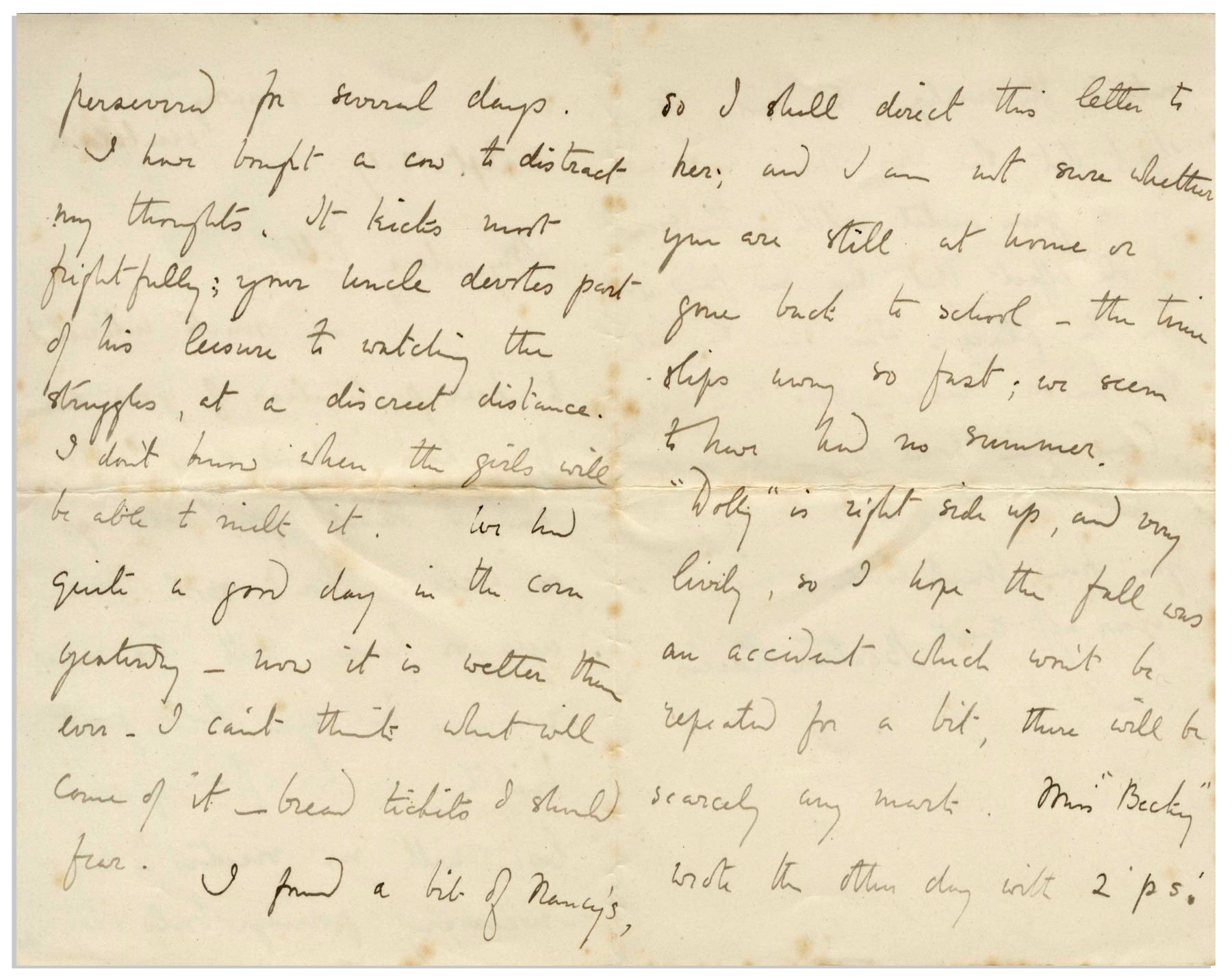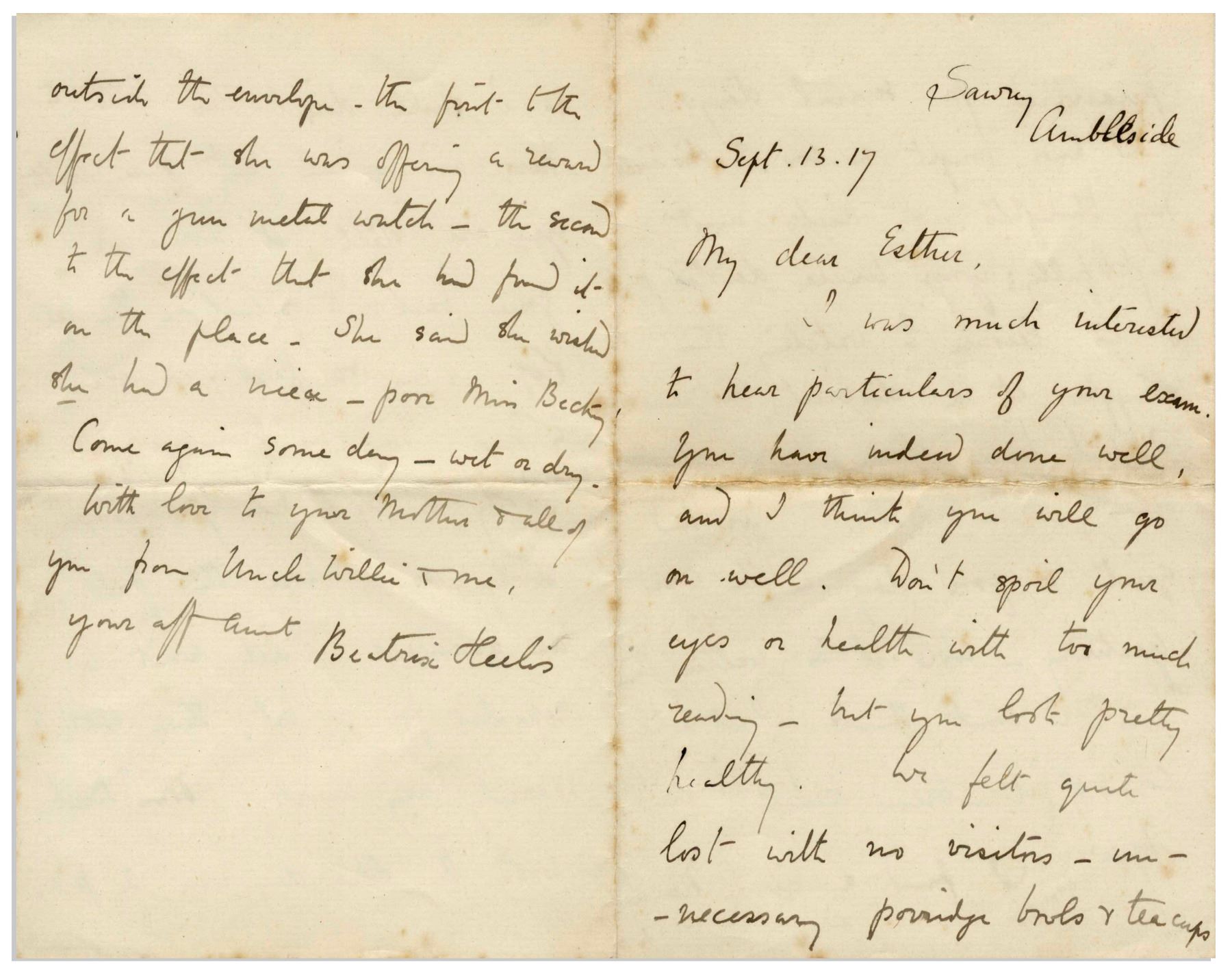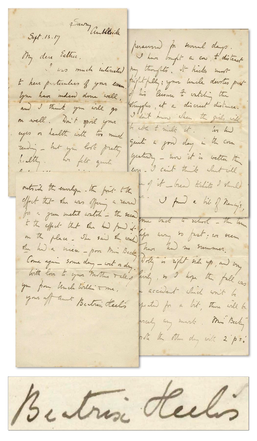 Beatrix Potter autograph letter signed, written on 13 September 1917 to her niece Esther Nicholson. The famed children's author pens a warm letter full of interesting anecdotes about her life. From Sawrey Ambleside, letter reads in full, ''My dear Esther, I was much interested to hear particulars of your exam. You have indeed done well, and I think you will go on well. Don't spoil your eyes or health with too much reading - but you look pretty healthy. We felt quite lost with no visitors - unnecessary porridge bowls & tea cups persevered for several days. I have bought a cow to distract my thoughts. It kicks most rightfully; your Uncle devotes part of his leisure to watching the struggles, at a discreet distance. I don't know when the girls will be able to milk it. We had quite a good day in the corn[?] yesterday - now it is better than ever - I can't think about what will come of it - bread tidbits I should fear. I found a bib of Nancy's, so I shall direct this letter to her; and I am not sure whether you are still at home or gone back to school - the time slips away so fast; we seem to have had no summer. 'Dolly' is right side up, and very lively, so I hope the fall was an accident which won't be repeated for a bit, there will be scarcely any mark. Miss 'Becky' wrote the other day with 2 'ps.' outside the envelope. The first to the effect that she was offering a reward for a [?] metal watch - the second to the effect that she had found it on the place - She said she wished she had a niece - poor Miss Becky! Come again some day - wet or dry. With love to your Mother & All of you from Uncle Willie & me. Your aff Aunt Beatrix Heelis''. Four page letter on bifolium, card style stationery measures 4.5'' x 7'' as folded. Light foxing and single fold; very good condition.