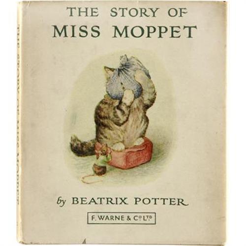 <B>Beatrix Potter. </B></I><B><I>The Story of Miss Moppet</B></I></B></I><B>.</B></I> London: Frederick Warne & Co., Ltd., [no date].<BR> <BR>Later printing? Twentyfourmo. 29 pages. Color illustrations in text.<BR><BR>Original pictorial boards with titles in green on the front board and spine. Pictorial endpapers. 1935 dated gift inscription on the half-title page. Clean externally and internally in a slightly toned and chipped price-clipped dust jacket. Very good condition.<BR><BR><BR><b>Shipping:</b> Books & Catalogs (<a target="_blank" href="http://www.heritageauctions.com/common/shipping.php">view shipping information</a>)