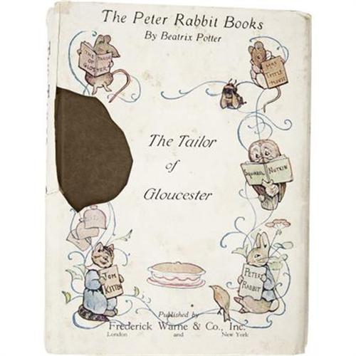 <B>Beatrix Potter. The Tailor of Gloucester. New York: Frederick Warne & Co., 1903.</B></I><BR> <BR>First American edition? Twentyfourmo. 76 pages. With color plates in text.<BR><BR>Original brown paper over boards with color Peter Rabbit illustration inset on the front board and titles in light grey. Pictorial endpapers. Back strip missing from spine, hinges cracking, else sound. Old gift inscription on the half-title page. Dust jacket price-clipped, soiled and with a section of loss on the front panel. Good condition.<BR><BR><BR><b>Shipping:</b> Books & Catalogs (<a target="_blank" href="http://www.heritageauctions.com/common/shipping.php">view shipping information</a>)