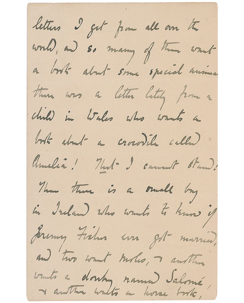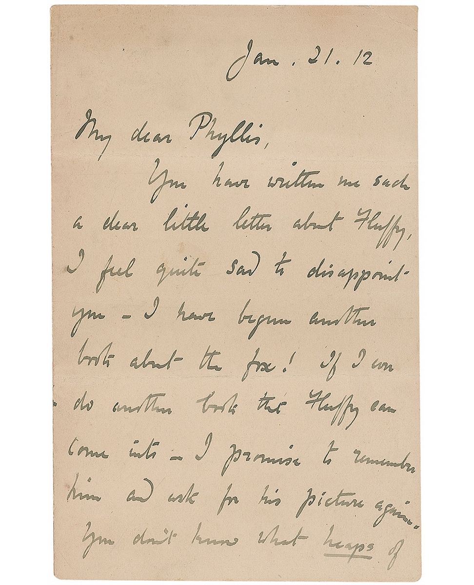 British author and illustrator (1866–1943) whose Edwardian-era tales of naughty rabbits, ‘bad’ mice, and other amusingly mischievous animals take a place among the most enduring and beloved works in the annals of children’s literature. Her first and best-known book, The Tale of Peter Rabbit, has sold more than 40 million copies since it was first published in 1902. ALS, four pages on two adjoining sheets, 3.75 x 6, January 21, 1912. Letter to a young admirer. In full: “You have written me such a dear little letter about Fluffy. I feel quite sad to disappoint you-I have begun another book about the fox! If I can do another book that Fluffy can come in to—I promise to remember him and ask for his picture again. You don’t know what heaps of letters I get from all over the world, and so many of them want a book about some special animal. There was a letter recently from a child in Wales who wants a book about a crocodile called Amelia! That I cannot stand! Then there is a small boy in Ireland who wants to know if Jeremy Fisher ever got married. And two want moles, & another wants a donkey named Salome, & another wants a horse book, and another wants hens, & another wants elephants—poor Miss Potter!