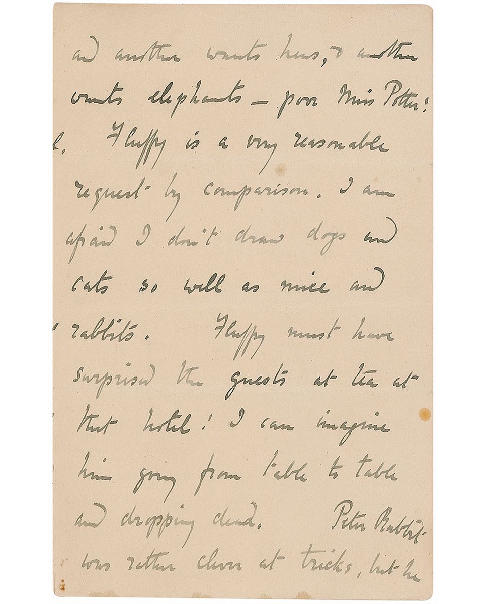Potter’s letters to children often included stories she had invented and anecdotes about her pets. In this wonderful 1912 letter, she mentions her latest book “about a fox,” referring to The Tale of Mr. Tod, a children’s book about a badger named Tommy Brock and his fox neighbor, Mr. Tod. Potter found inspiration for her work in the country setting of her beloved Castle Farm in the English Lakes District and the story is set in the farm’s fields. She also mentions other books in the letter, including the tales of Peter Rabbit and Mr. Jeremy Fisher. Potter letters of this kind and content are rarely offered, and her wonderful description of her greatest character, Peter Rabbit, make this especially desirable.