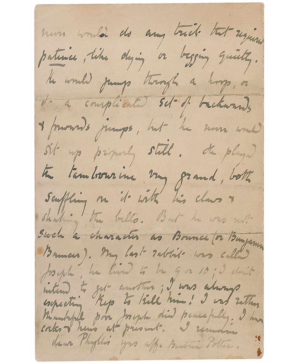 Fluffy must have surprised the guests at tea at that hotel! I can imagine him going from table to table and dropping dead. Peter Rabbit was rather clever at tricks, but he would never do any trick that required patience, like dying or begging quietly. He would jump through a hoop, or do a complicated set of backwards and forwards jumps, but he never would sit up properly still. He played the tambourine very grand, both scuffling on it with his claws and shaking the bells. But he was not such a character as Bounce (or Benjamin Bouncer). My last rabbit was called Joseph, he lived to be 9 or 10; I don’t intend to get another; I was always expecting Kep to kill him! I was rather thankful poor Joseph died peacefully. I have cocks and hens at present. I remain dear Phyllis ys aff.” In very good condition, with three horizontal folds, a few light corner creases, a few small spots (including two next to signature), and light toning and soiling, a bit heavier to last page.