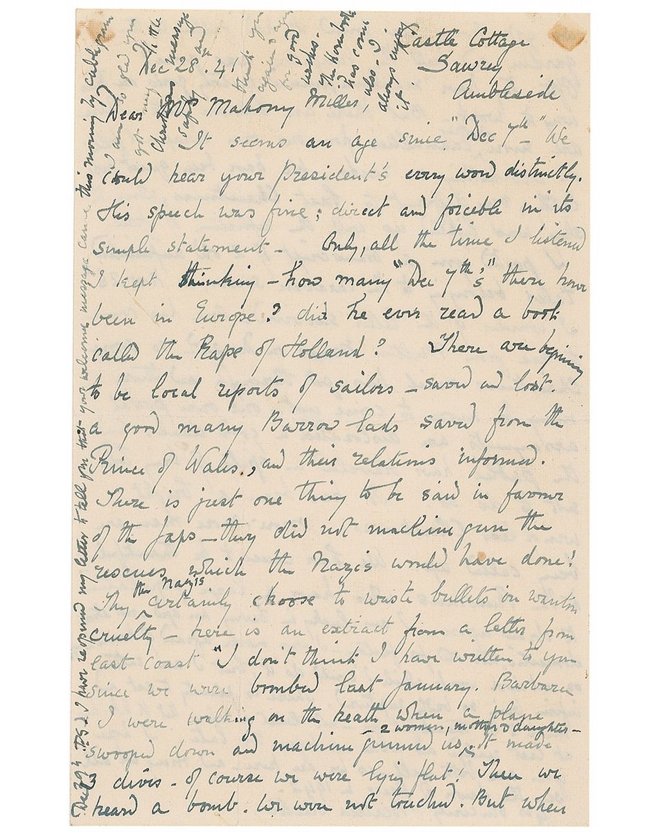 Potter lived in the countryside at Hill Top Farm in Near Sawrey for most of her adult life, including during wartime, where she felt relatively safe given the remote area; she did, however, believe that her estate was situated on the path of a bombing route, as planes were constantly flying overhead. There had been a brief scare earlier in 1941, when an entire print run of The Tale of Peter Rabbit was destroyed during a bombing raid on London. Potter's original watercolor illustrations for the books were returned to her at Hill Top Farm for safekeeping, given the diminished threat. One of the "old unfinished tales" she mentions sending was likely 'Wag-by-Wall,' a story she began in 1909 and intended for inclusion in The Fairy Caravan, but was never actually published. Near the end of her life, she granted Miller permission to publish it in a Christmas edition of The Horn Book. Between the mention of her work and discerning remarks on World War II—including an allusion to President Roosevelt's 'Day of Infamy' speech following the attack on Pearl Harbor—this is an immensely fascinating letter.