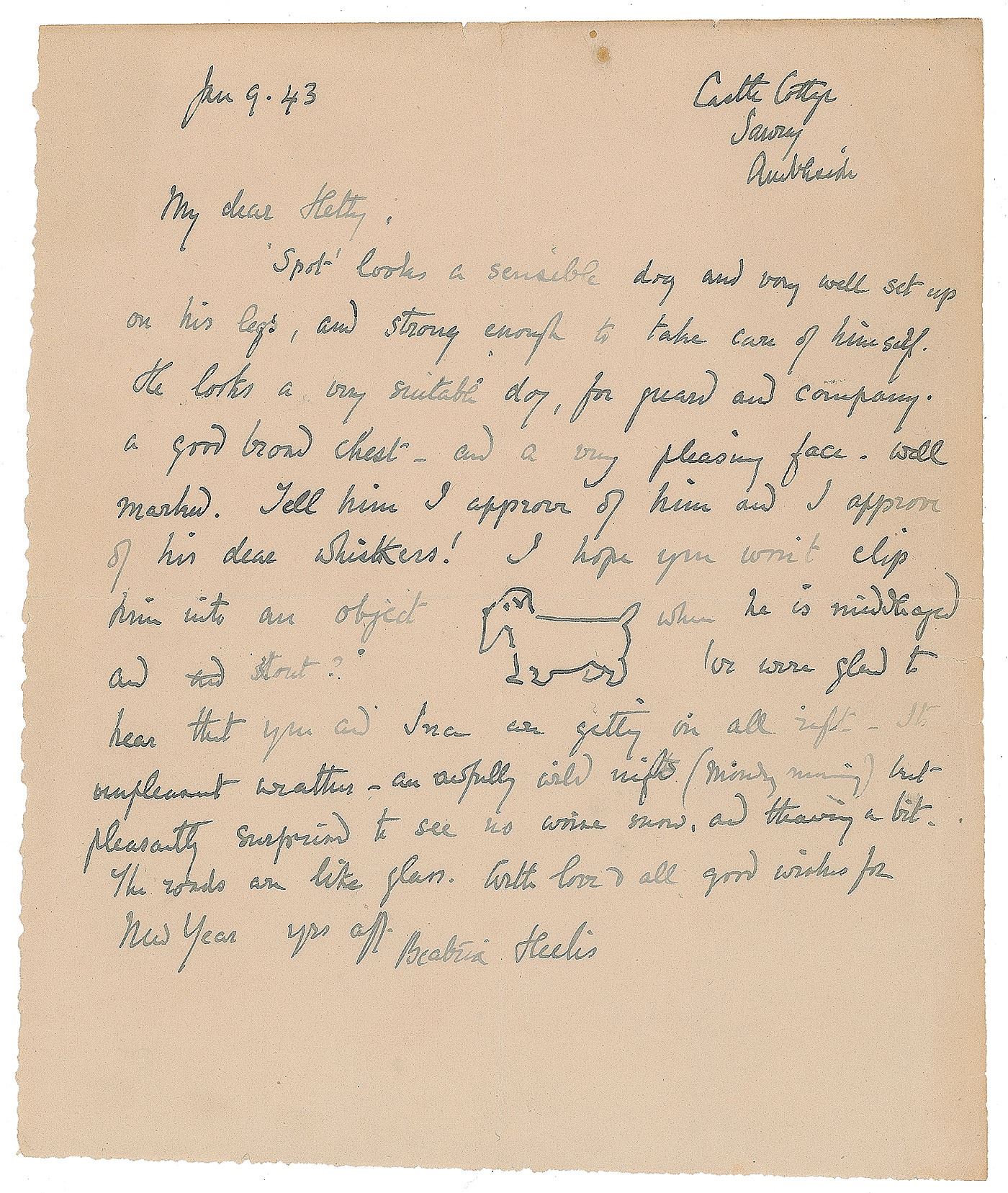 ALS signed “Beatrix Heelis,” 6.25 x 7.5, January 9, 1943. Written from Castle Cottage, a letter to Margaret "Hetty" Douglas, in full: "'Spot' looks a sensible dog and very well set up on his legs, and strong enough to take care of himself. He looks a very suitable dog, for guard and company. A good brown chest, and a very pleasing face—well marked. Tell him I approve of him and I approve of his dear whiskers! I hope you won't clip him into an object when he is middle-aged and stout. We were glad to hear that you and Ina are getting on all right. It's unpleasant weather, an awfully wild night (Monday morning) but pleasantly surprised to see no worse snow, and thawing a bit. The roads are like glass. With love & all good wishes for New Year." Potter adds a small sketch of a bearded dog within the body of the letter. In fine condition, with light creasing and intersecting folds. Hetty Douglas was the niece of Mary Welsh Scott, the wife of Beatrix's younger brother, Walter Bertram. During their childhood both Beatrix and her brother kept an array of pets—rabbits, mice, frogs, lizards, snakes, and a bat—creatures that helped unify their love for nature and art by serving as models for their endless sketching. Potter’s career in children’s literature began with a letter to a sickly boy named Noel, the son of her former governess Annie Carter Moore, which contained a quick tale of ‘four little rabbits,’ and featured a number of cute rabbit sketches. The letter offered here, although written in the year of Potter’s passing at the age of 77, holds much of the same youthful charm redolent of her earliest missives.