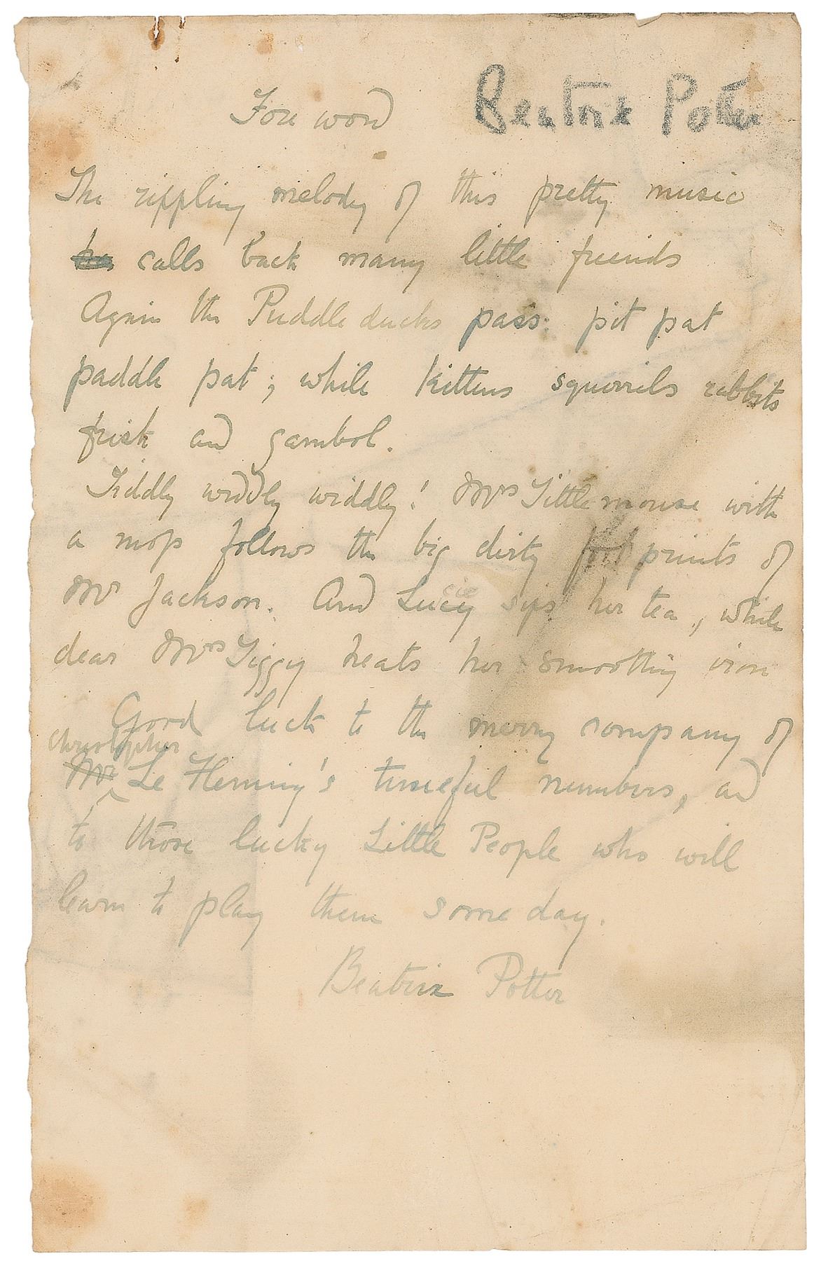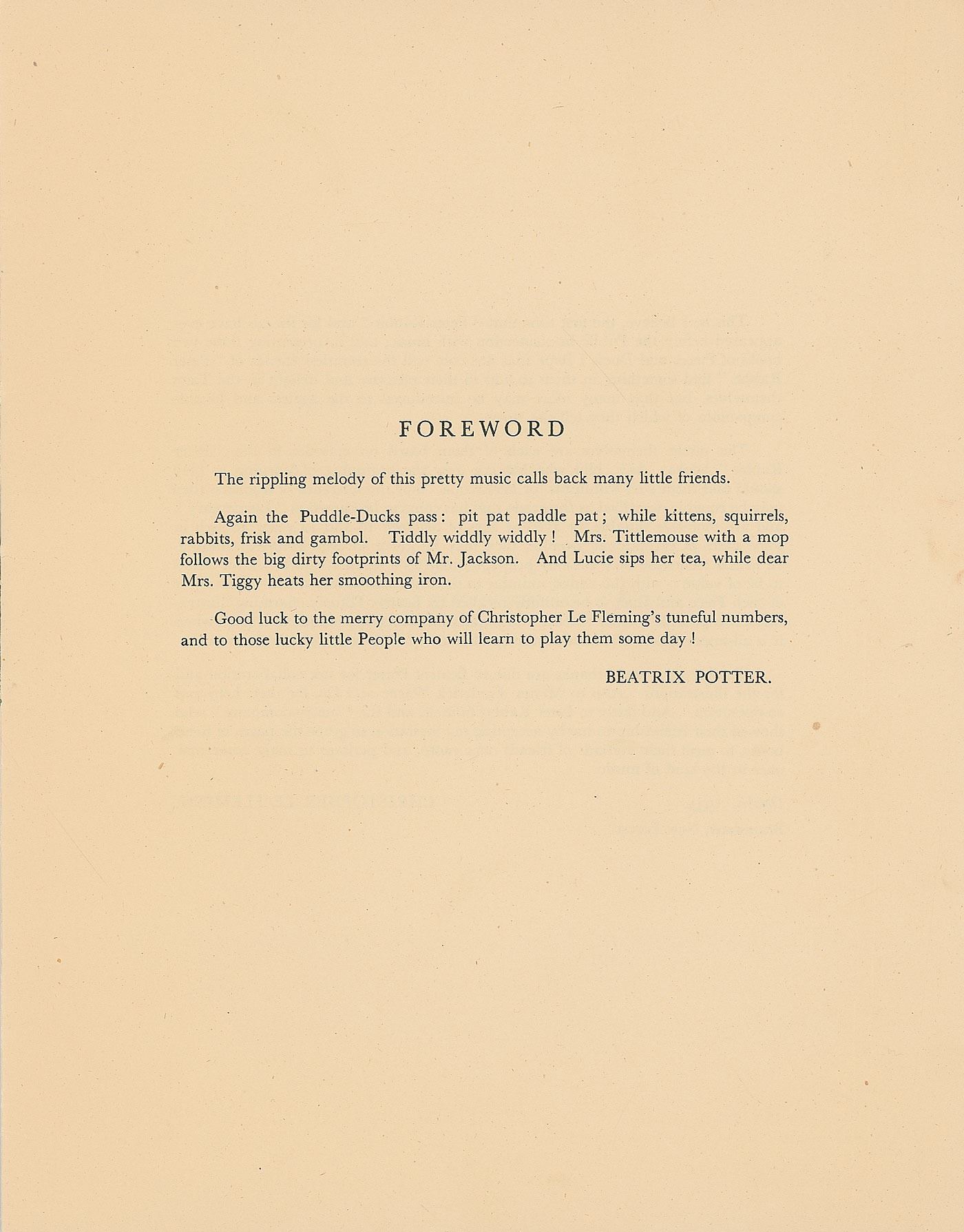 An exceptional pair of items related to the publication of a collection of sheet music entitled The Peter Rabbit Music Books, comprised of Potter’s autograph manuscript for the foreword and a letter Potter wrote to the composer, Christopher Le Fleming. AMS signed “Beatrix Potter,” one page, 5 x 8, no date. The foreword of the book, in full: “The rippling melody of this pretty music calls back many little friends. Again the Puddle ducks pass: pit pat paddle pat; while kittens squirrels rabbits frisk and gambol. Tiddly widdly widdly! Mrs. Tittlemouse with a mop follows the big dirty footprints of Mr. Jackson. And Lucie sips her tea, while dear Mrs. Tiggy heats her smoothing iron. Good luck to the merry company of Christopher Le Fleming's tuneful numbers, and to those lucky Little People who will learn to play them some day.”
