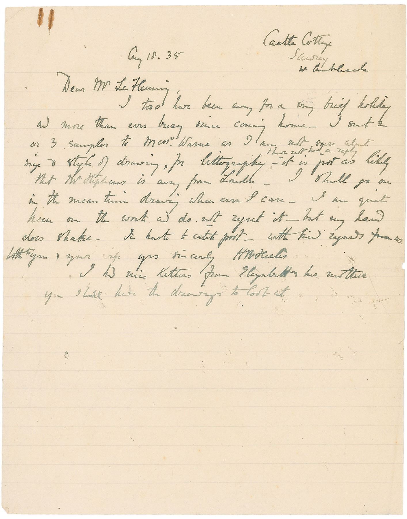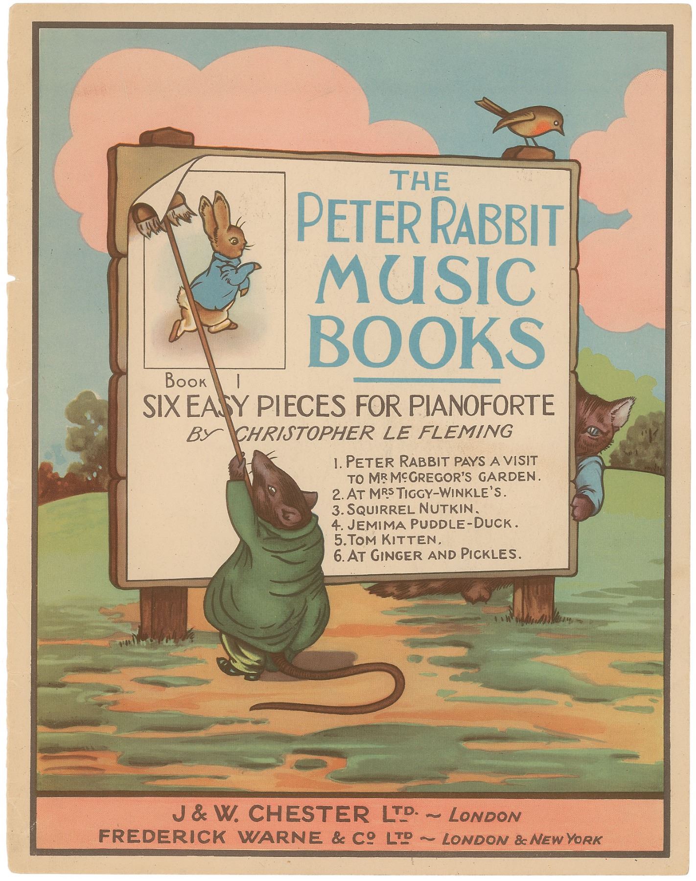 Also, an ALS signed with her married name, “H. B. Heelis,” one page, lightly-lined, 7.75 x 9.75, August 18, 1935. Letter to Le Fleming, in part: “I too have been away for a very brief holiday and more than ever busy since coming home—I sent 2 or 3 samples to Messrs. Warne as I am not sure about size and style of drawing for lithography—I have not had a reply—it is just as likely that Mr. Stephens [Arthur L., Managing Director of Warne] is away from London. I shall go on in the mean time drawing when ever I can. I am quite keen on the work and do not reject it—but my hand does shake…I had nice kittens from Elizabeth & her mother. You shall have the drawings to look at.” In overall very good condition, with moderate overall creases and soiling to the manuscript and intersecting folds, light creases, and a rusty paperclip mark to the letter. Accompanied by the final publication: The Peter Rabbit Music Books: Book I, Six Easy Pieces for Pianoforte. London: J. & W. Chester, Frederick Warne & Co., 1935. Softcover, 9.5 x 12, 17 pages. Partial splitting to the spine, otherwise fine condition.