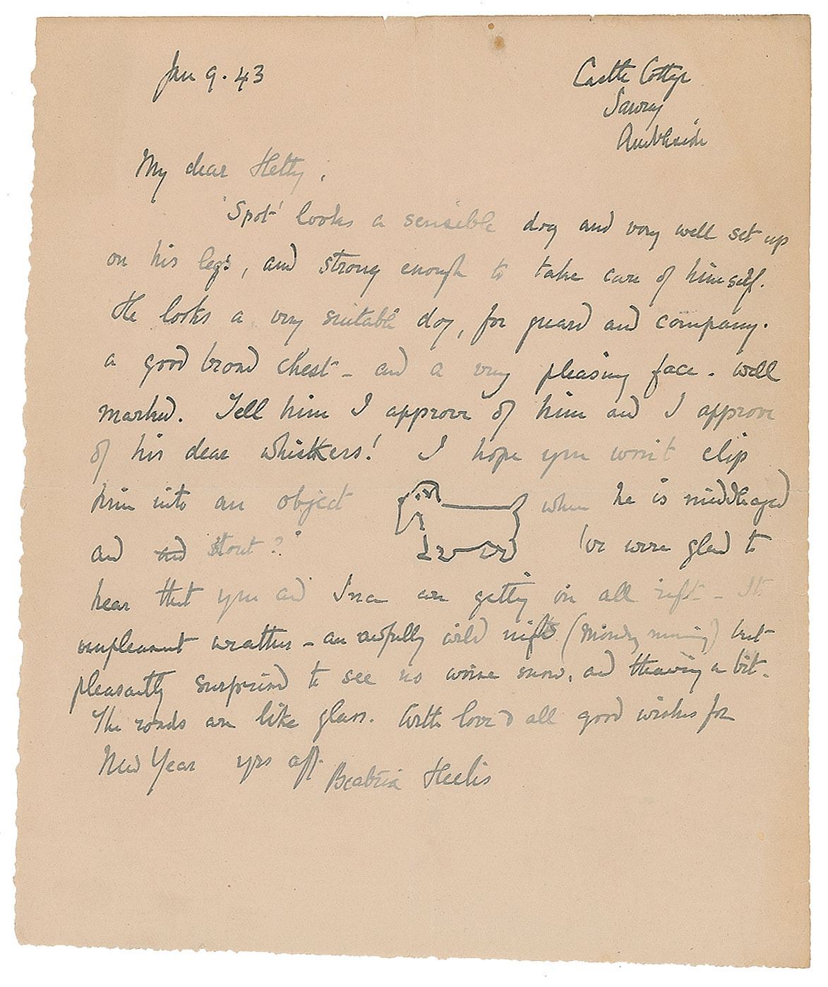 ALS signed “Beatrix Heelis,” 6.25 x 7.5, January 9, 1943. Written from Castle Cottage, a letter to Margaret "Hetty" Douglas, in full: "'Spot' looks a sensible dog and very well set up on his legs, and strong enough to take care of himself. He looks a very suitable dog, for guard and company. A good brown chest, and a very pleasing face—well marked. Tell him I approve of him and I approve of his dear whiskers! I hope you won't clip him into an object when he is middle-aged and stout. We were glad to hear that you and Ina are getting on all right. It's unpleasant weather, an awfully wild night (Monday morning) but pleasantly surprised to see no worse snow, and thawing a bit. The roads are like glass. With love & all good wishes for New Year." Potter adds a small sketch of a bearded dog within the body of the letter. In fine condition, with light creasing and intersecting folds. Hetty Douglas was the niece of Mary Welsh Scott, the wife of Beatrix's younger brother, Walter Bertram. During their childhood both Beatrix and her brother kept an array of pets—rabbits, mice, frogs, lizards, snakes, and a bat—creatures that helped unify their love for nature and art by serving as models for their endless sketching. Potter’s career in children’s literature began with a letter to a sickly boy named Noel, the son of her former governess Annie Carter Moore, which contained a quick tale of ‘four little rabbits,’ and featured a number of cute rabbit sketches. The letter offered here, although written in the year of Potter’s passing at the age of 77, holds much of the same youthful charm redolent of her earliest missives.