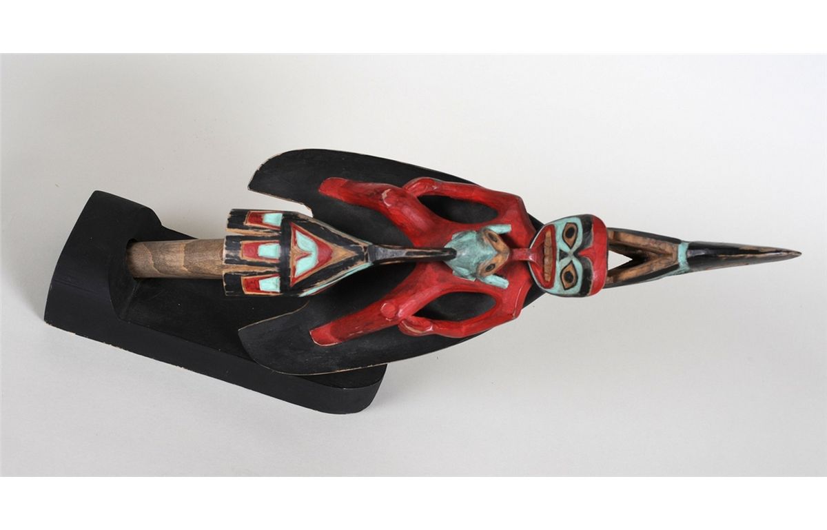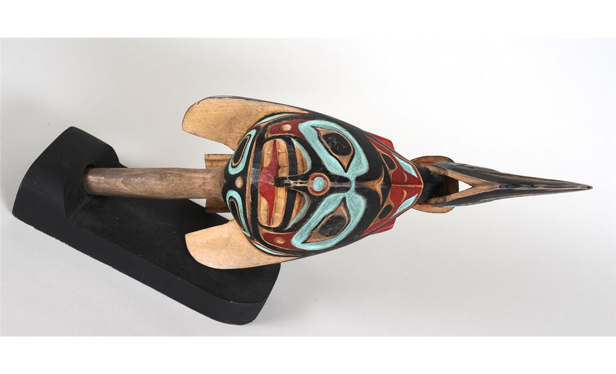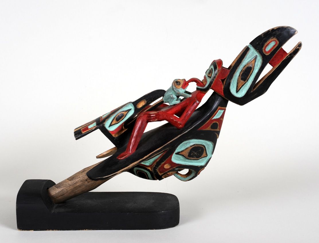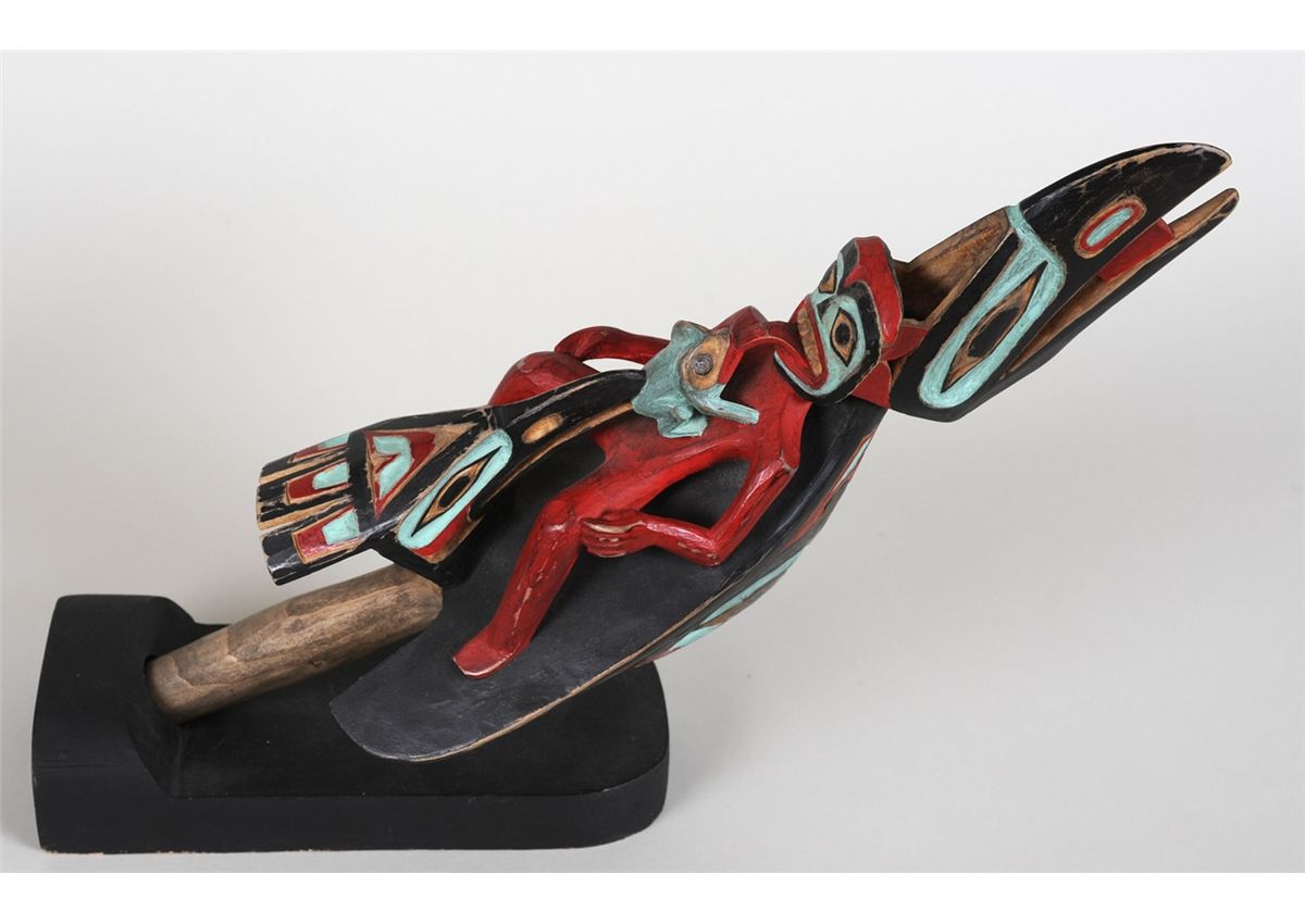 Beau Dick Raven Rattle with Reclining Shaman, Raven Holding Frog and Hawkman on the Bottom - Signed on Rattle and Base 16 1/2" L. 5 1/2" W. 4 1/2" H. Good Condition