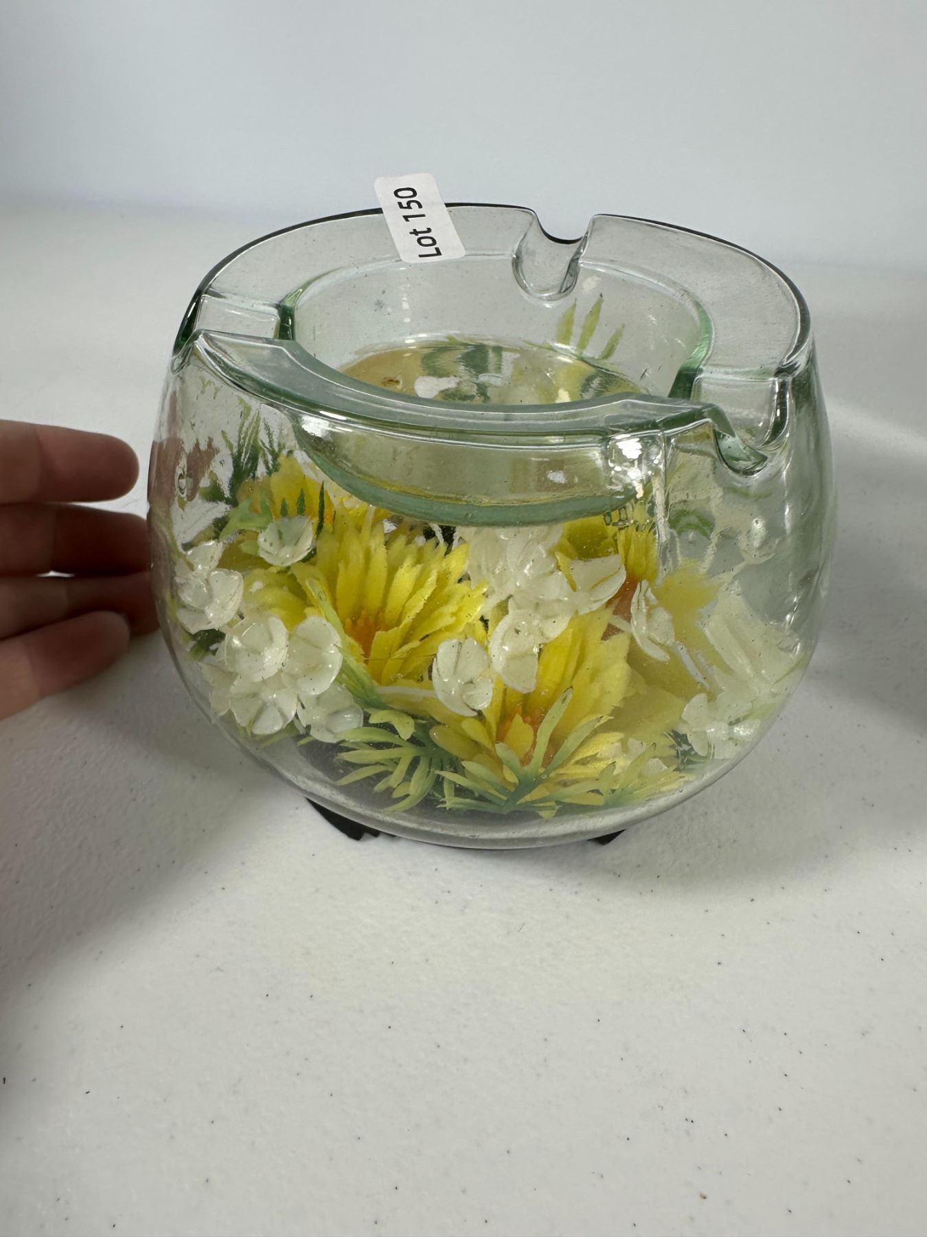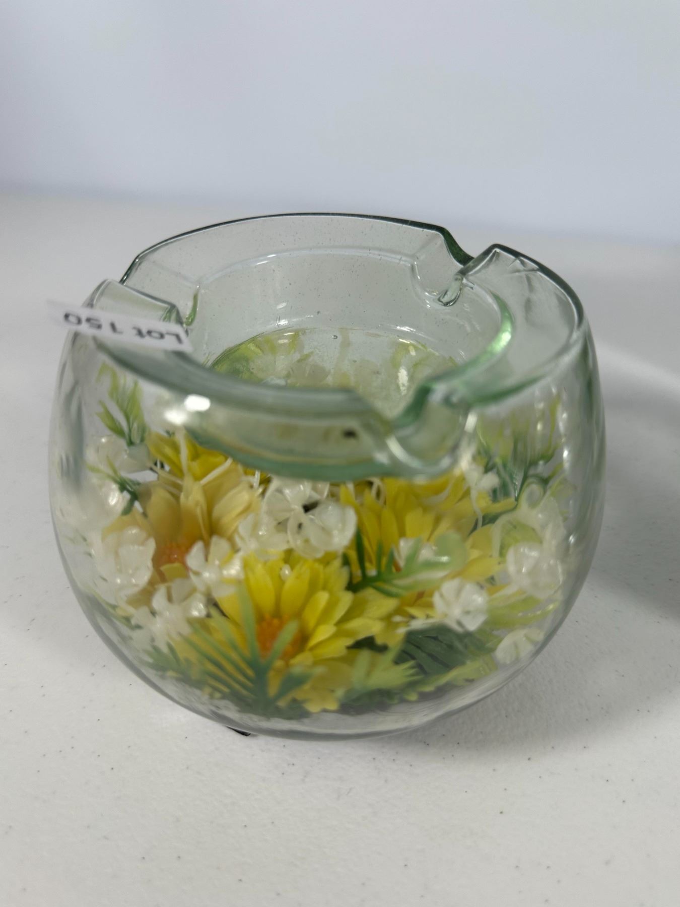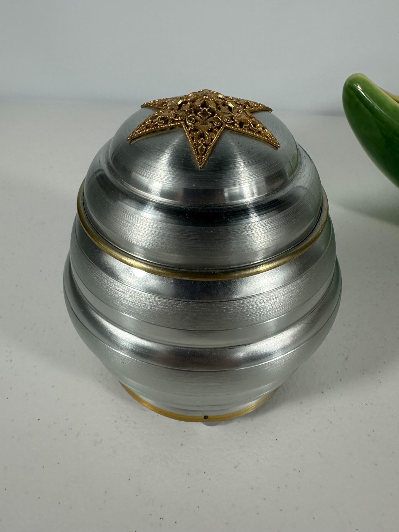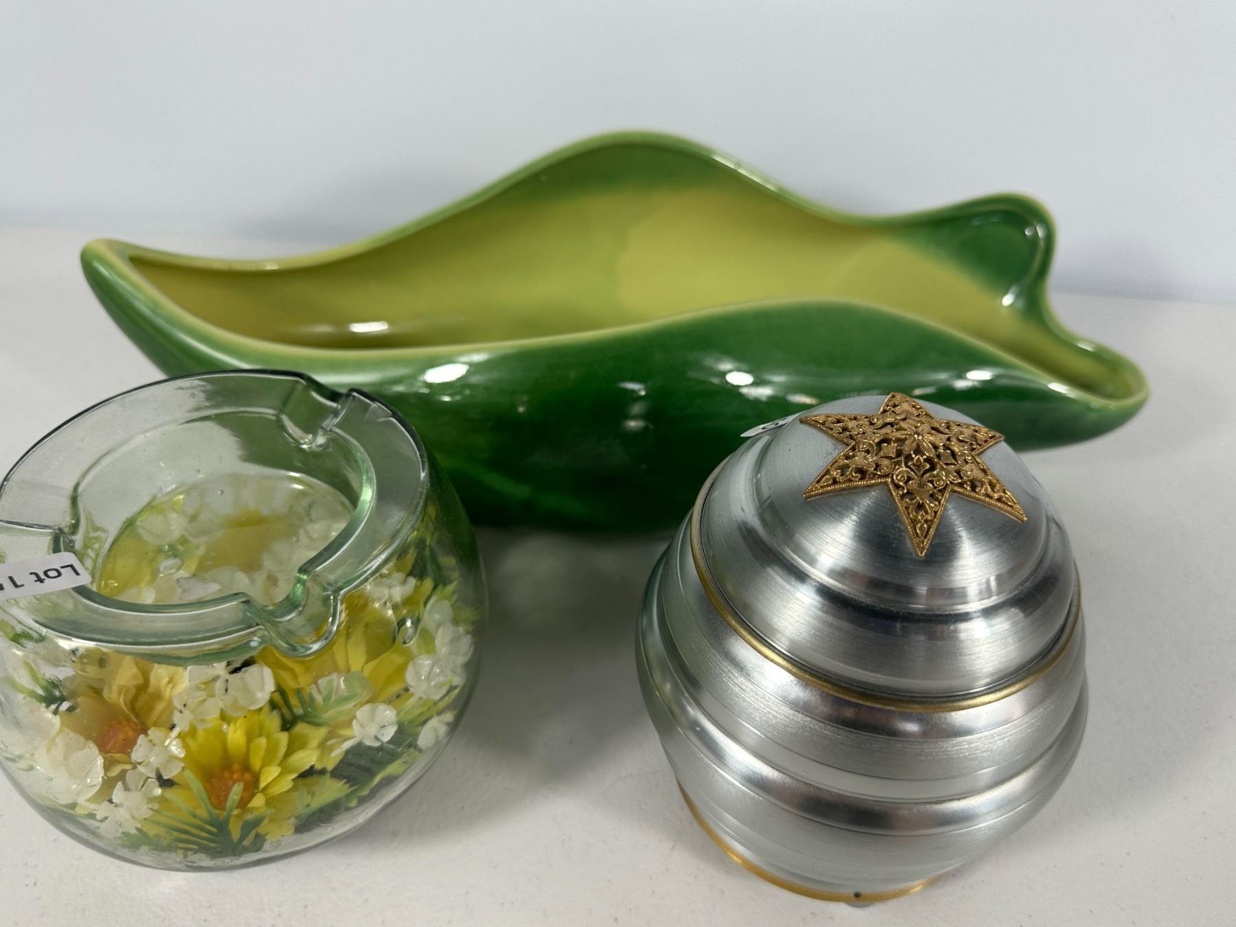 Features a Beauceware Canada green leaf-shaped dish, accompanied by a floral-embedded ashtray and a silver-tone lidded trinket box with gold star finial. A charming mix of vintage décor.