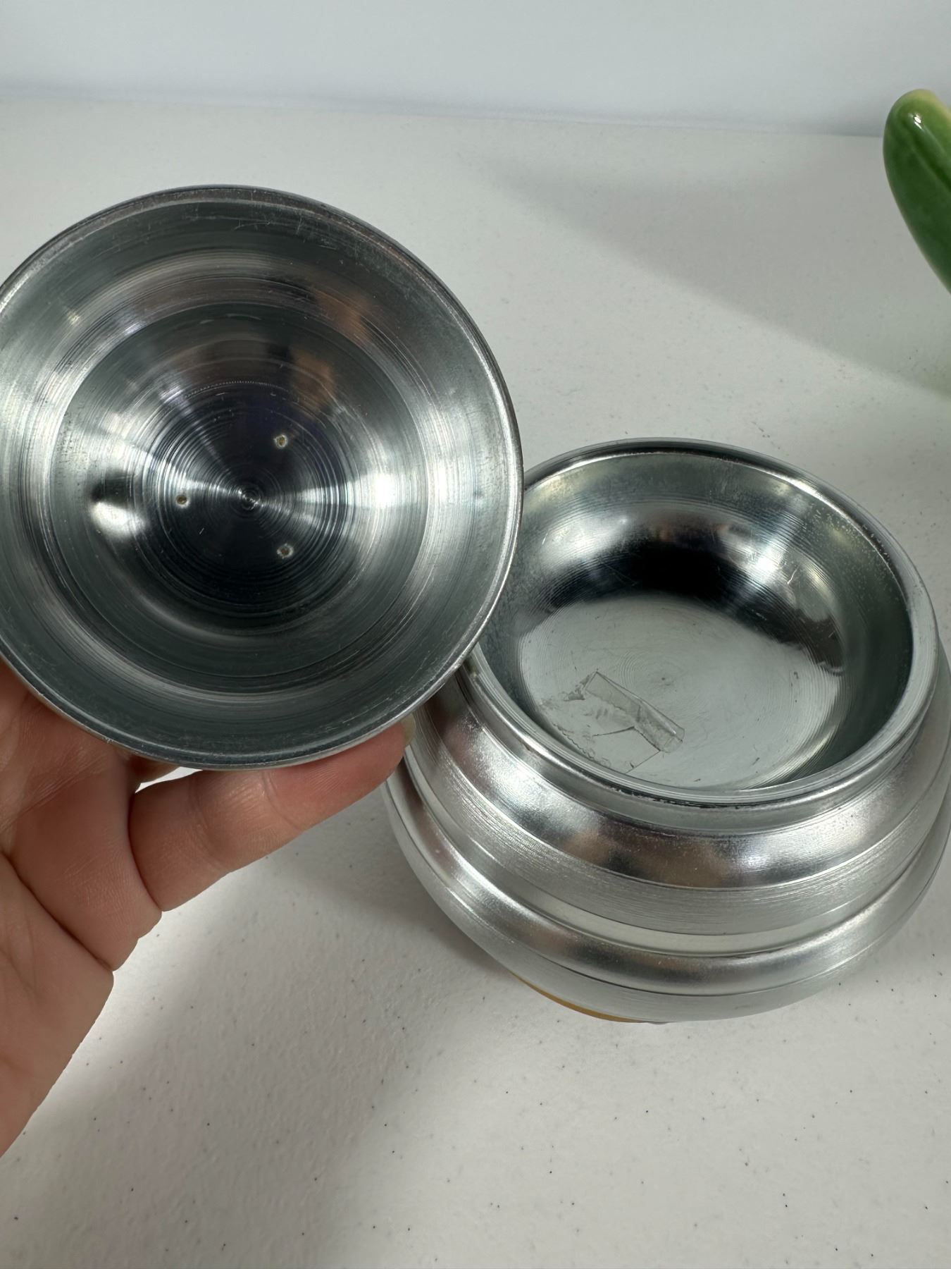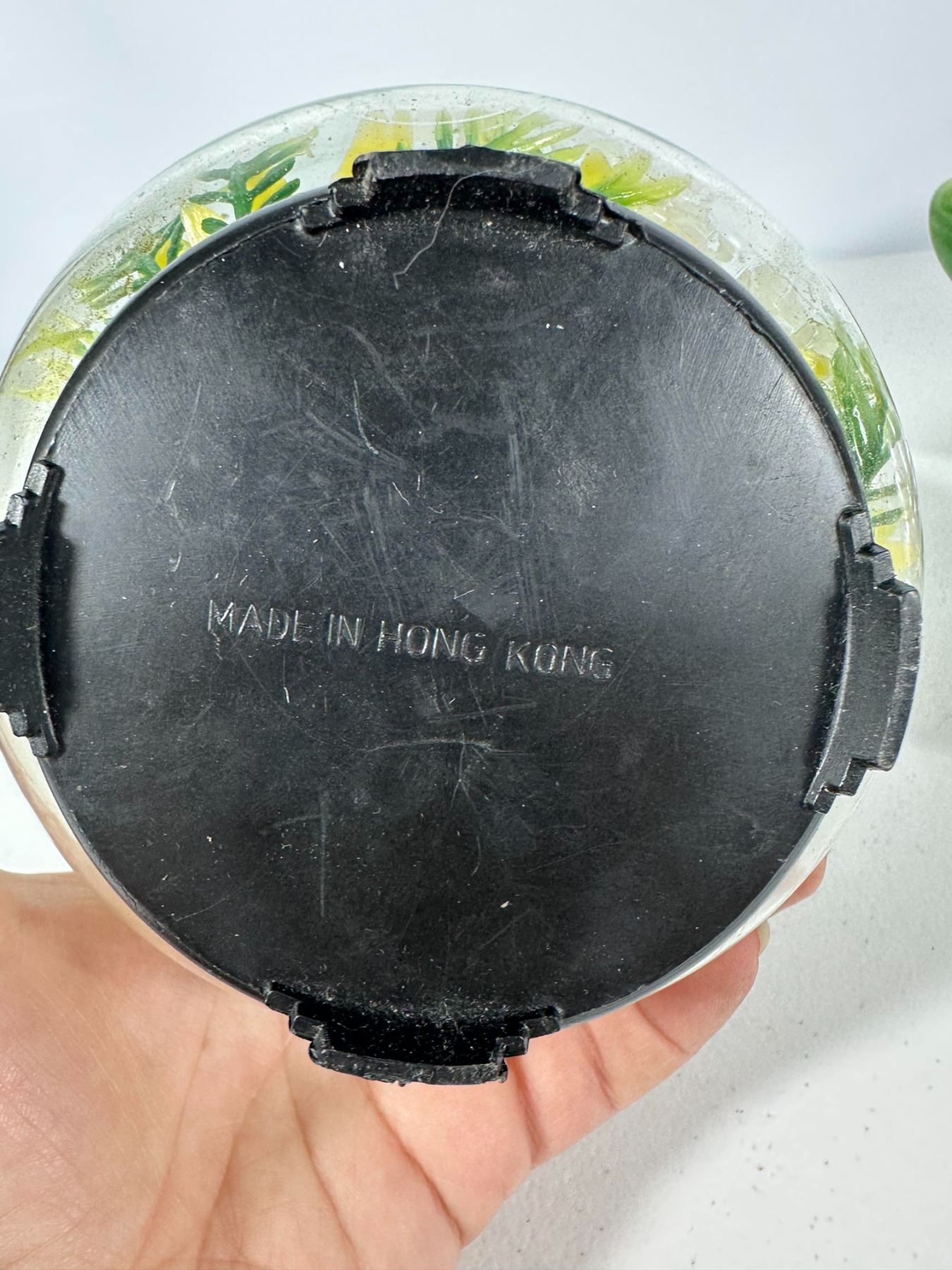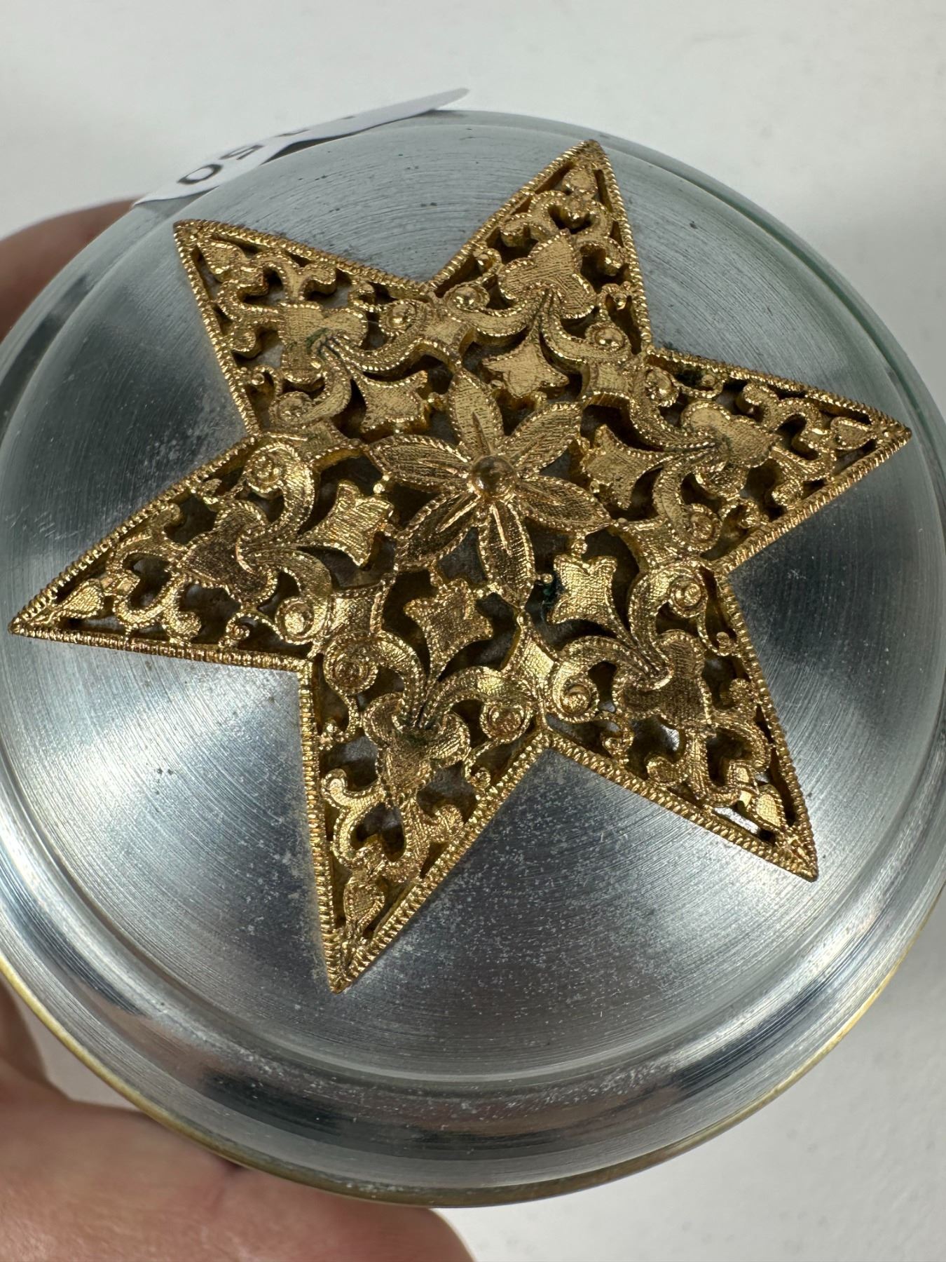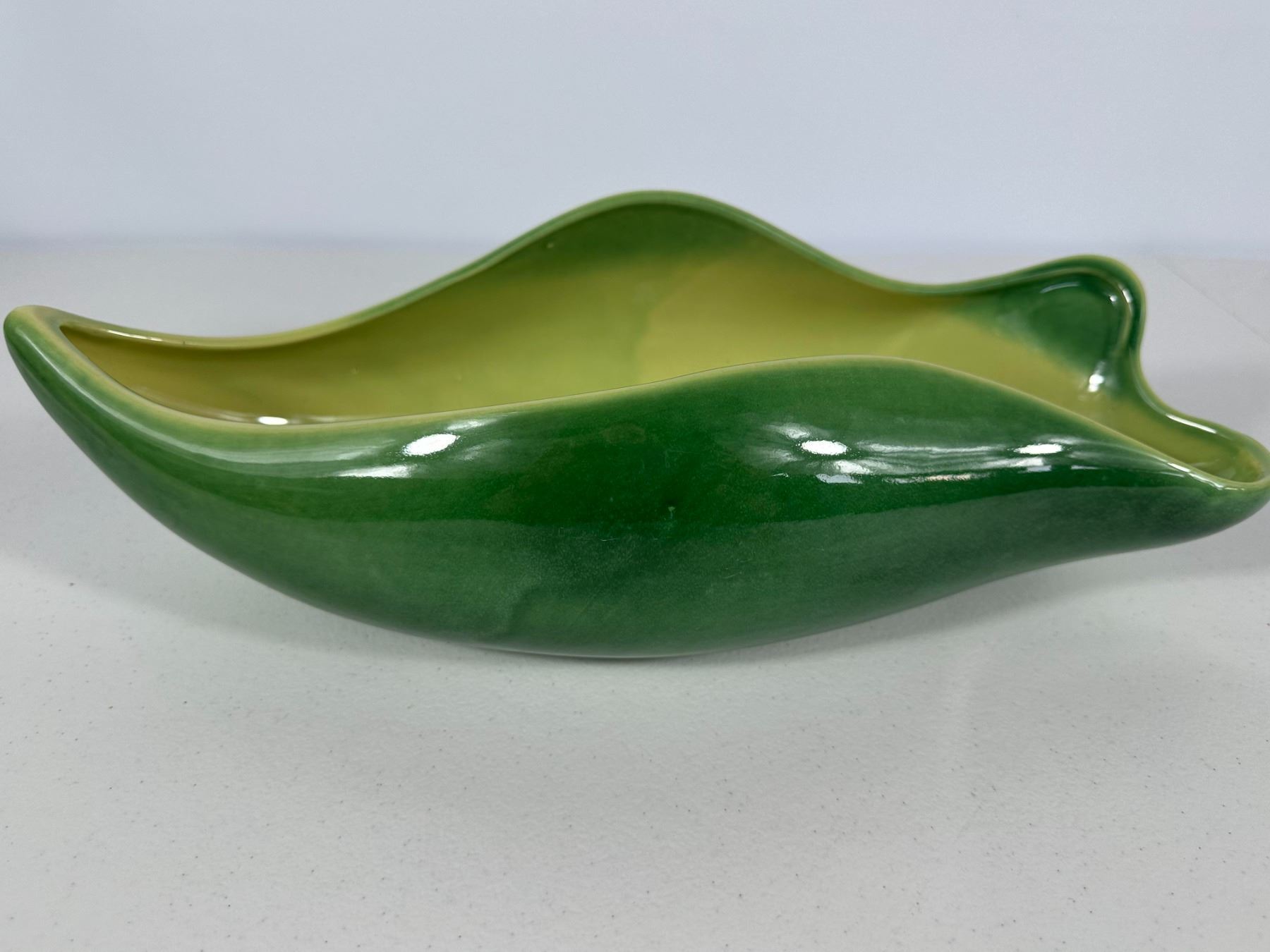 Features a Beauceware Canada green leaf-shaped dish, accompanied by a floral-embedded ashtray and a silver-tone lidded trinket box with gold star finial. A charming mix of vintage décor.