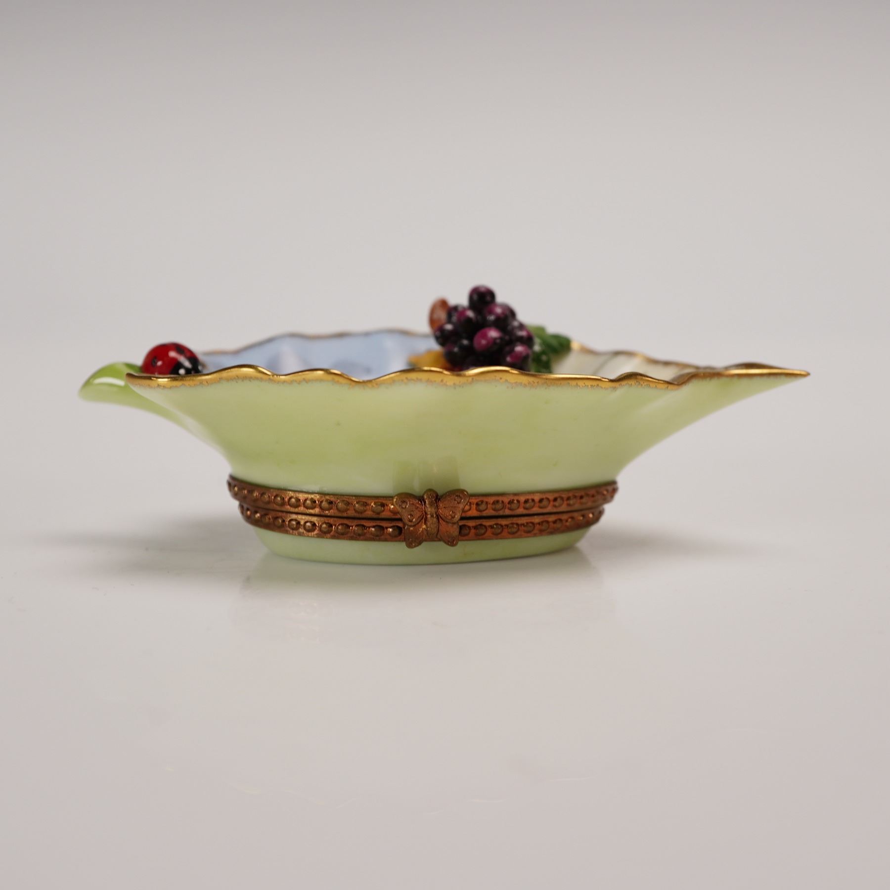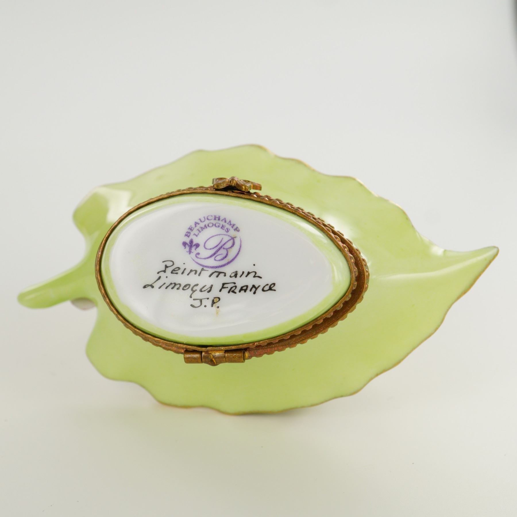 A porcelain trinket box by Beauchamp Limoges, crafted in the shape of a scalloped leaf. The hinged lid features hand-painted multicolor leaves, a ladybug, and a cluster of raised grapes, accented with gold trim. The clasp is shaped like a butterfly, and the interior is decorated with a painted fruit motif. Includes original box and certificate. Marked for Beauchamp Limoges, France.