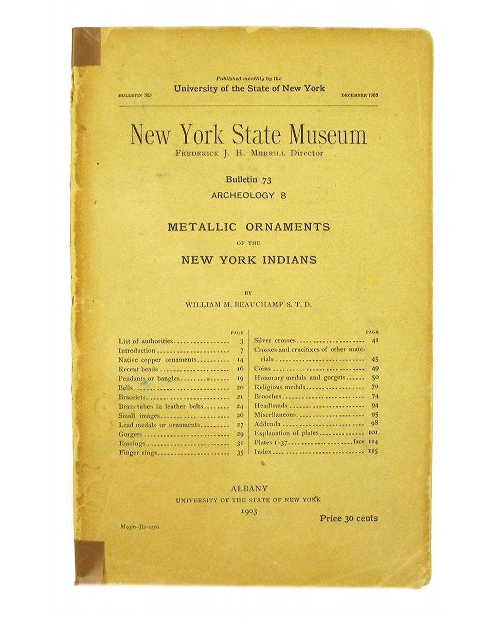 Beauchamp, William M. METALLIC ORNAMENTS OF THE AMERICAN INDIANS. Albany: University of the State of New York, 1903. 8vo, original printed tan card covers. 120, (6) pages [covers included in pagination]; 37 plates, depicting ornaments, Indian trade silver, the Red Jacket medal, Montreal medals, etc. Covers taped at top and bottom of spine; very good or better. New York State Museum, Bulletin 73. The author cites Betts and Leroux and carried on an extensive correspondence with Robert W. McLachlan. In a substantial chapter entitled "Honorary Medals and Gorgets," Beauchamp, while expressing high regard for McLachlan, enumerates differences with him on several key points expressed in the latter's 1883 article entitled "The Montreal Indian Medal." McLachlan was quite favorably impressed with the Beauchamp work at hand, terming it a "most learned and exhaustive monograph." This, however, did not prevent him from strongly countering Beauchamp's arguments in a 1905 American Journal of Numismatics article with the same title as his 1883 work (an early manuscript of this article was sold in the 1994 Kolbe/Spink Sale, lot 595). A major work of considerable numismatic interest, Metallic Ornaments is quite scarce and is rarely offered in numismatic circles.
