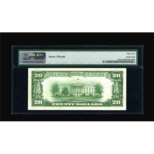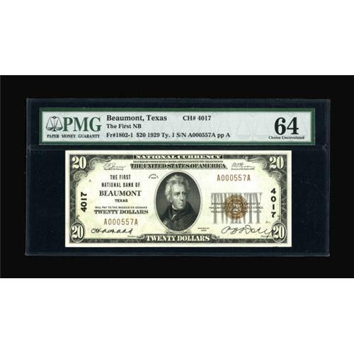 <B>Beaumont, TX</B></I> - $20 1929 Ty. 1 <B>The First NB</B></I> Ch. # 4017<BR> A scarcer bank in small size than large, with examples in this grade virtually never available. <B>PMG Choice Uncirculated 64.</B></I><BR><BR><b>Shipping:</b> Coins & Currency (<a target="_blank" href="http://www.heritageauctions.com/common/shipping.php">view shipping information</a>)