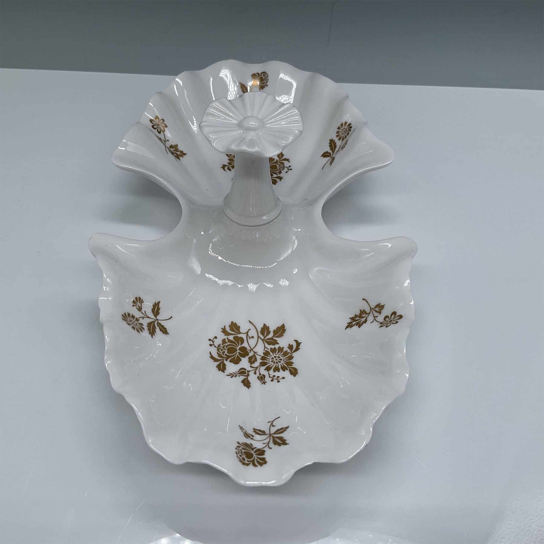 This elegant Beaumont by Spode shell-shaped serving dish features a pristine white china base with intricate gold floral accents. The central pedestal-style handle adds both functionality and sophistication, making it ideal for serving or as a decorative piece. Measuring 11"L x 3.25"H, this timeless design showcases Spode's renowned craftsmanship and attention to detail. Marked on the base, it is a perfect addition to a fine china collection or table setting.