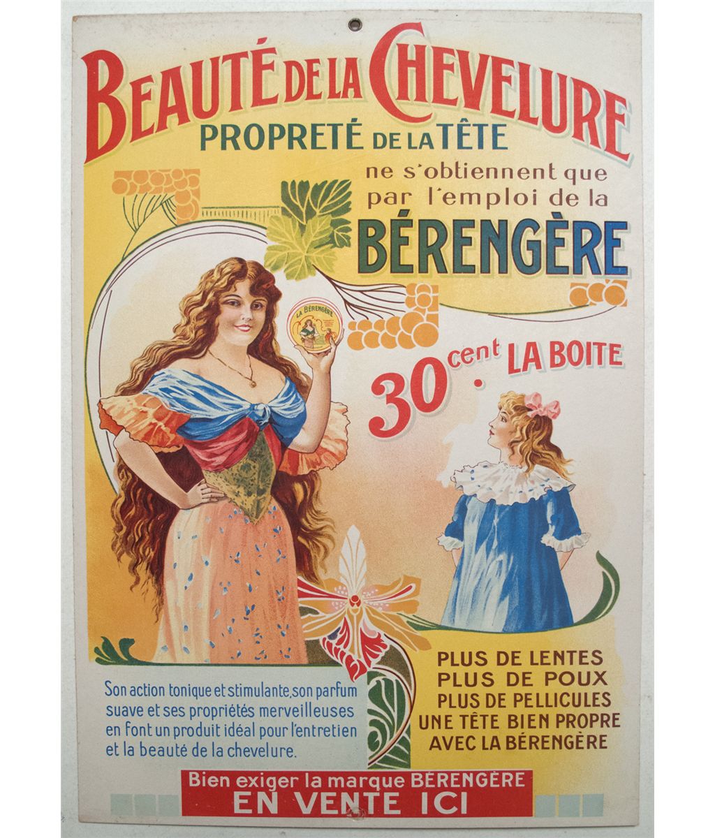 c1920's original French art nouveau cardboard advertising 18"x12" sign for hair beauty conditioner. Young French girl looking towards beautiful smiling woman holding a tin of the product. Very nice and colorful.