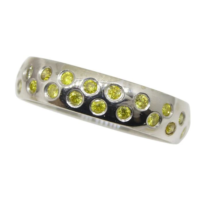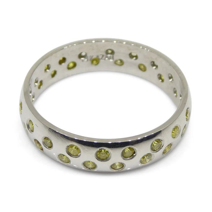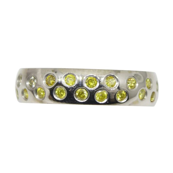 Breathtaking 0.68 Ct Yellow Diamonds are round brilliant cuts measuring 1.60 x 1.60 mm. These diamonds are set in 14k White Gold and reveal a lovely tone. Do not miss this one!!! Ring Size: 8.75. Total Weight of Item: 3.63g.