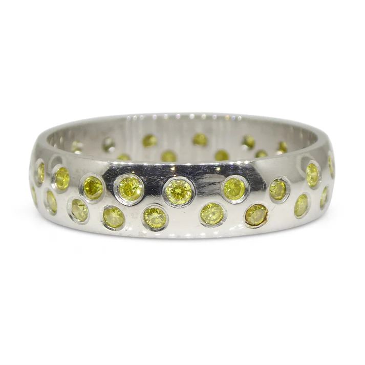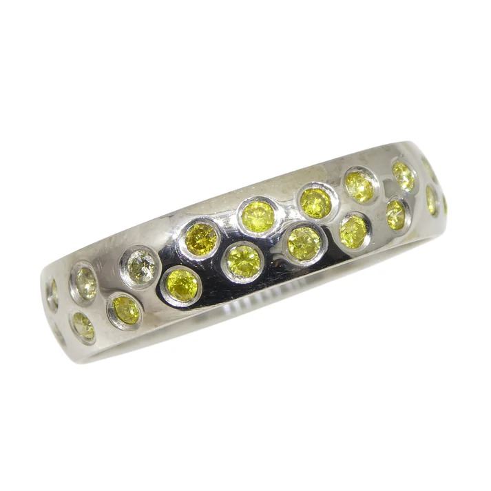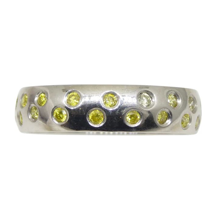Breathtaking 0.68 Ct Yellow Diamonds are round brilliant cuts measuring 1.60 x 1.60 mm. These diamonds are set in 14k White Gold and reveal a lovely tone. Do not miss this one!!! Ring Size: 8.75. Total Weight of Item: 3.63g.